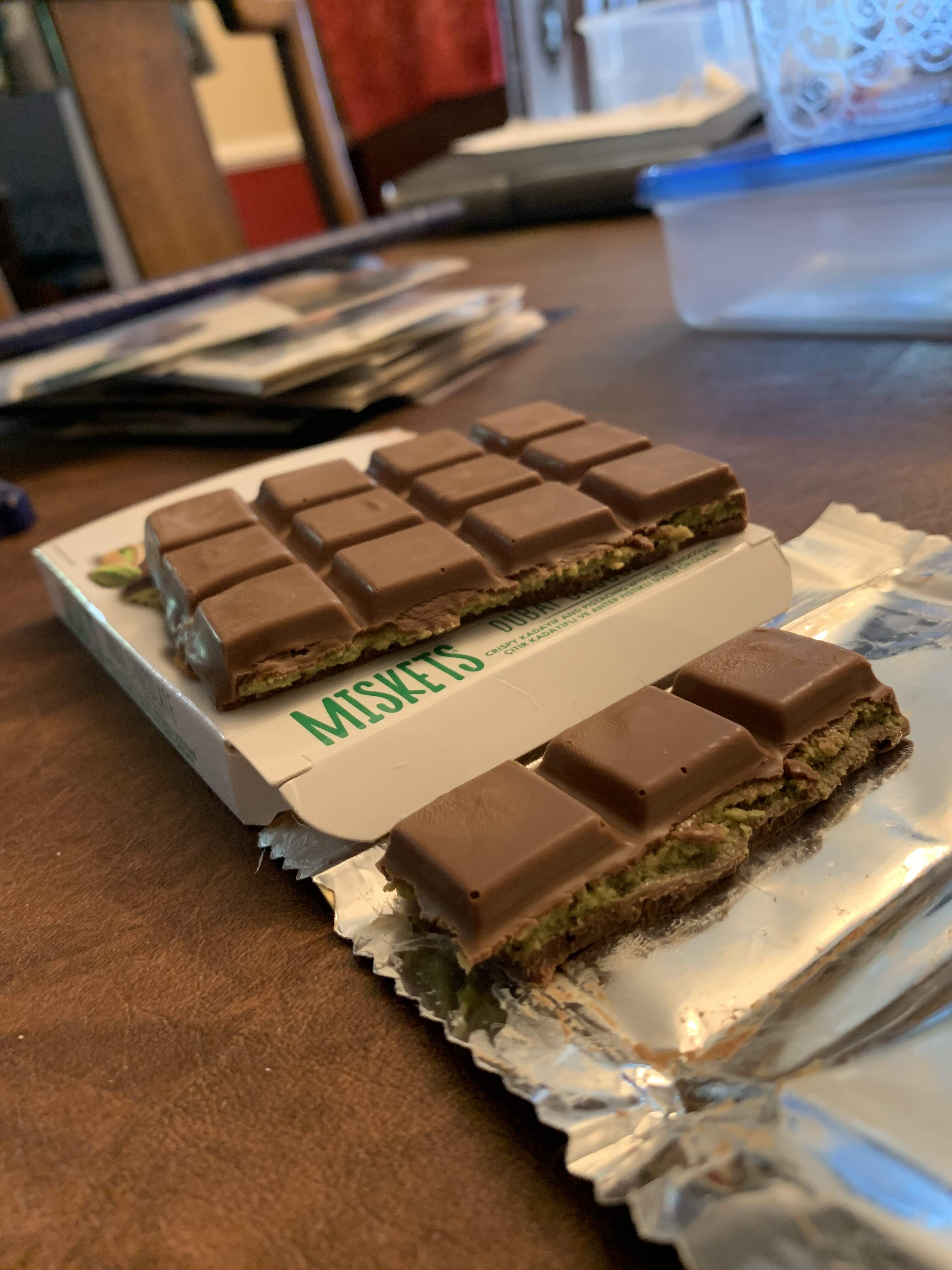 The fad must be waning, because Dubai chocolate finally came to our little town. Here we now have a Turkish version, currently On sale for $2.00 a bar.