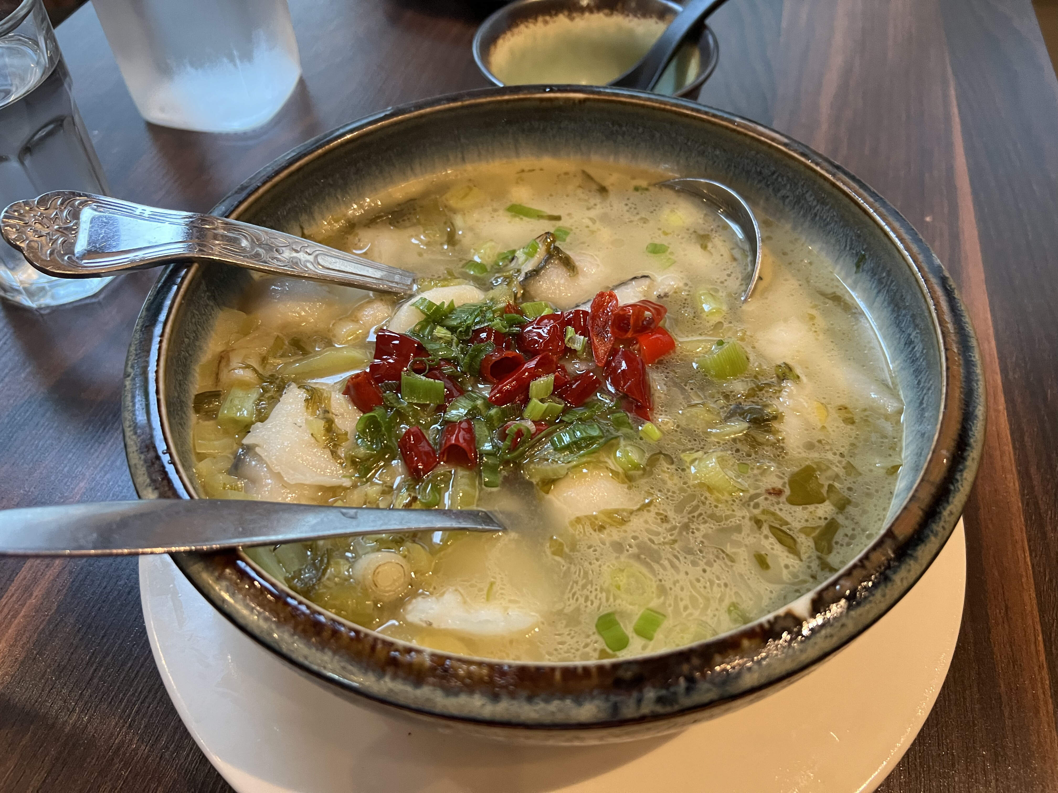 Fish fillets and tangy pickled cabbage in a spicy Szechuan broth, offering a bold & warming flavor profile.