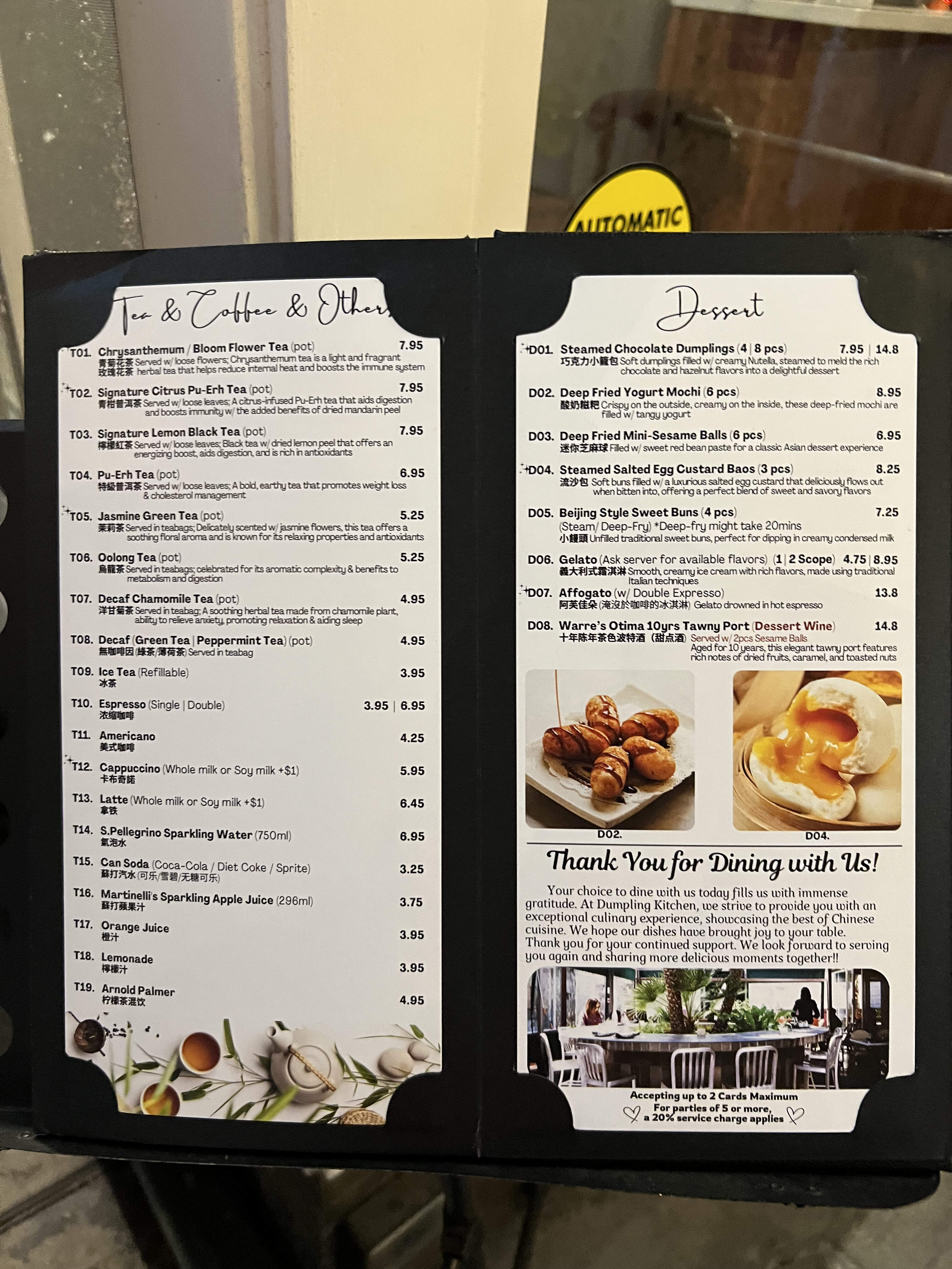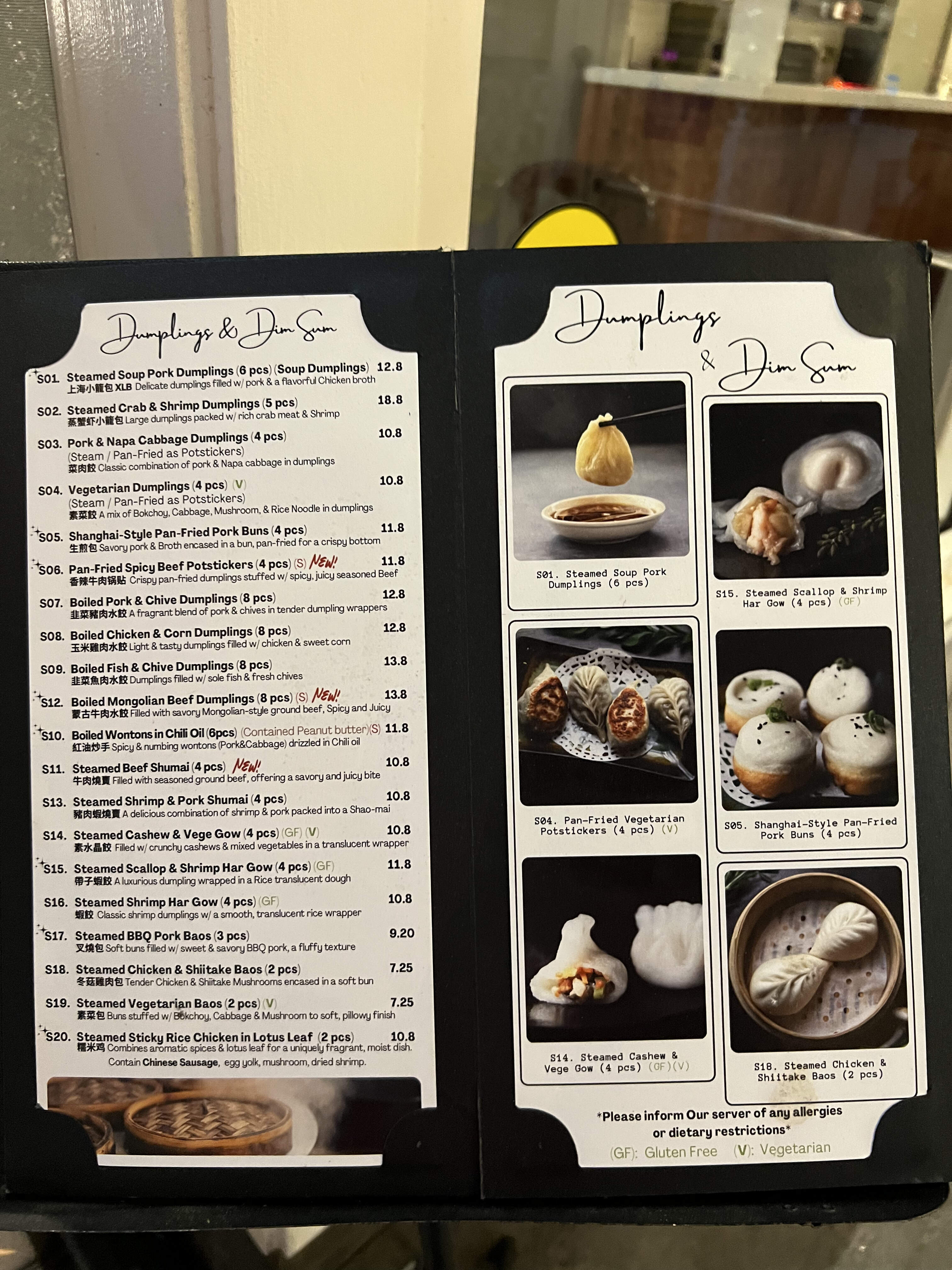 The menus - they have dishes from several regions, e.g. XLB and SJB from Shanghai, some Sichuan dishes like dandanmian and water boiled fish, Shandong zhajiangmian, Cantonese dim sum like siu mai and har gao, etc. and also some more fusion-y dishes. True to its name, there are many dumplings to choose from.