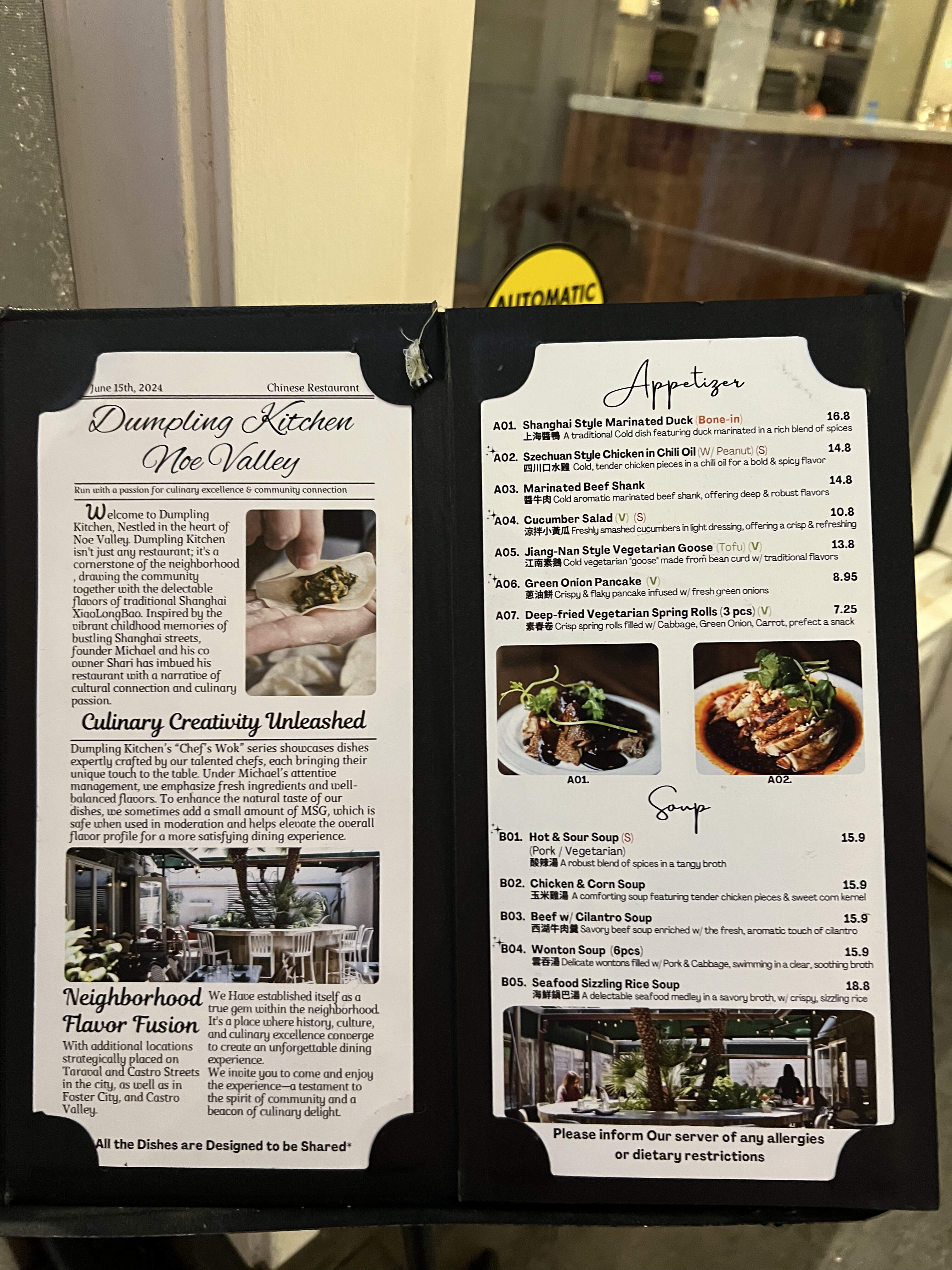 I had dinner recently at the Dumpling Kitchen in Noe Valley. It’s one of three Dumpling Kitchen locations in SF - the others are in the Parkside and in the Castro.
