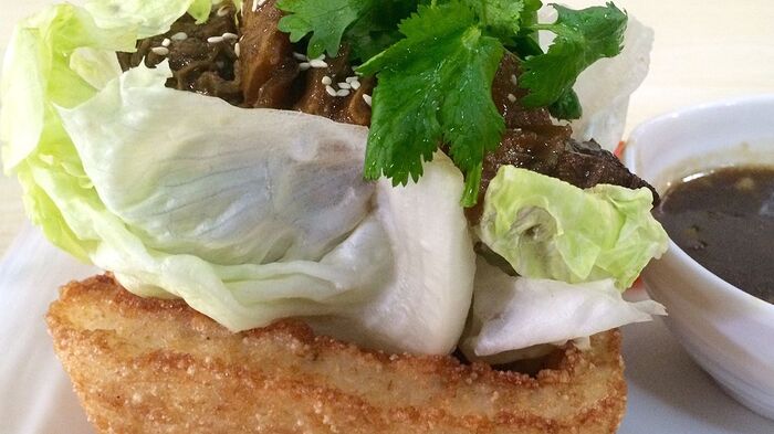 Chief among these is the cafe’s signature “rice cube” — a bowl’s worth of rice molded into the shape of a hollow box, scorched until all of the exposed surfaces have turned crispy and golden-brown, and then topped with chicken curry ($12.95) or beef stew ($13.95). The thing was somewhat awkward to eat, especially with the addition of a lettuce leaf that helped the structure maintain its sog-free integrity but felt superfluous unless you are a person who likes to mix salad into your beef stew. But the crispy rice alone was worth the price of admission — like the gloriously toasty crust that forms on the bottom of a stone-bowl bibimbap .