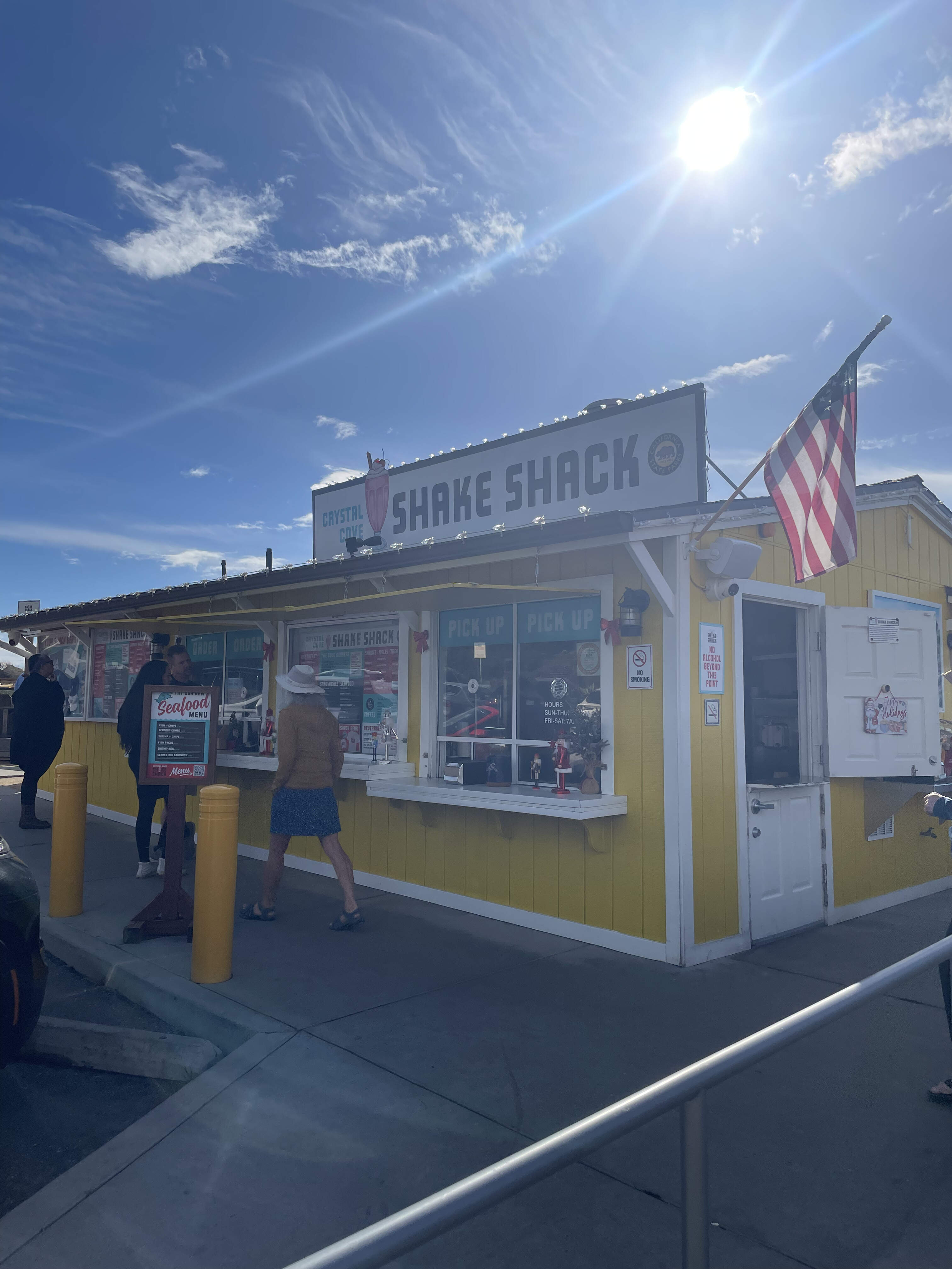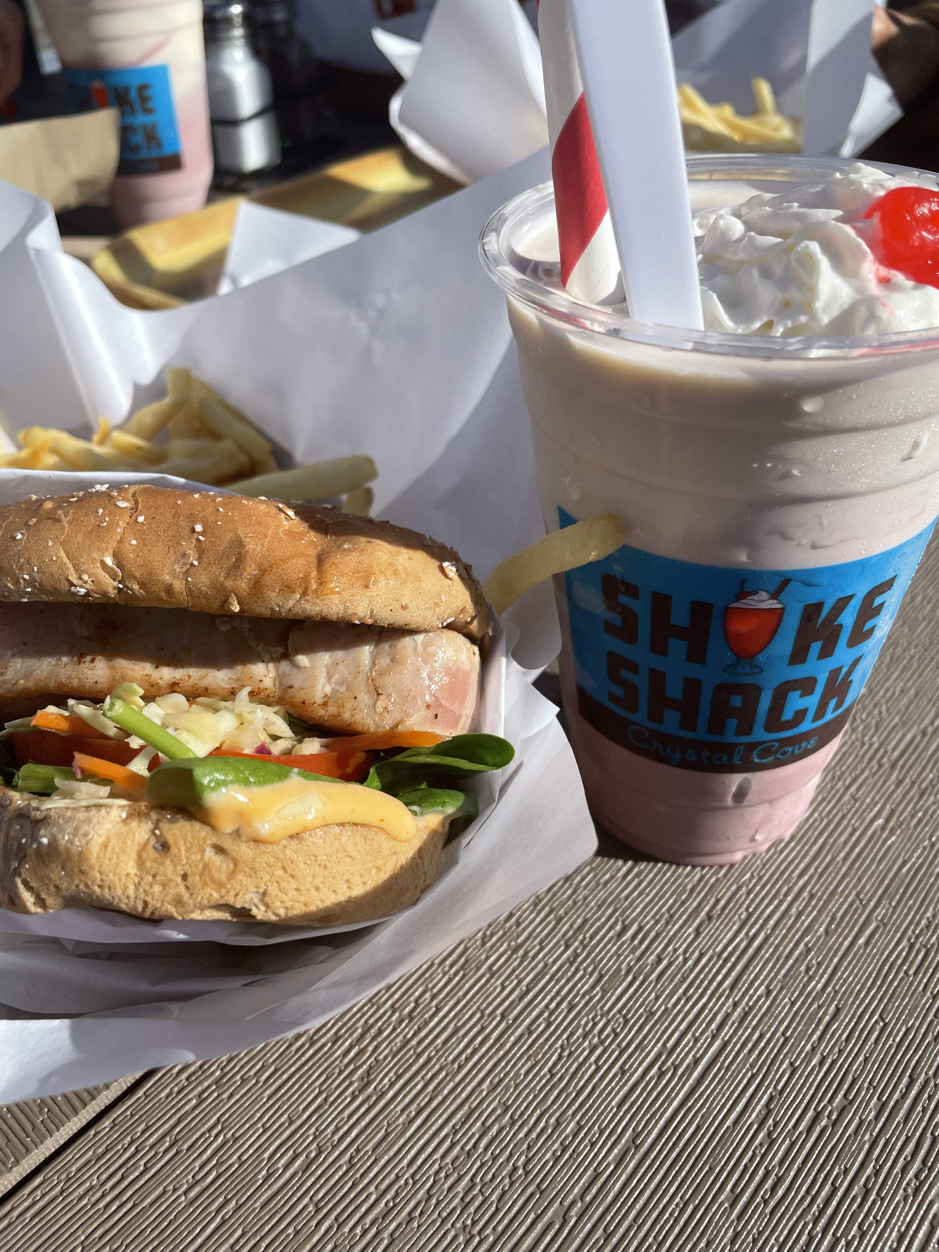 Today we walked the beach at Crystal Cove State Park in Newport Beach, and hiked up the bluff to Crystal Cove Shake Shack. This was truly a shack, unlike the Danny Meyers versions. My SO had a burger and fries, I had lightly seared ahi tuna on a grilled wheat bun (served with ginger herb slaw, fresh spinach, tomato, and sriracha mayo). The shakes (we both had black cherry) were fabulous, worth a drive themselves. So thick the large-diameter straw was barely servicable. Fortunately they also provided a spoon. This was not directly on the beach, but on a bluff overlooking the beach, and also a lovely spot…this one more rustic as it only had counter service.