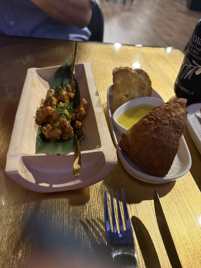Flat biscuits, just baked, with soft (ricotta?) cheese and fig jam. (So, my hotel is blocking downloading of my pictures to my computer…Going to pause this report till I can fix this issue!)
