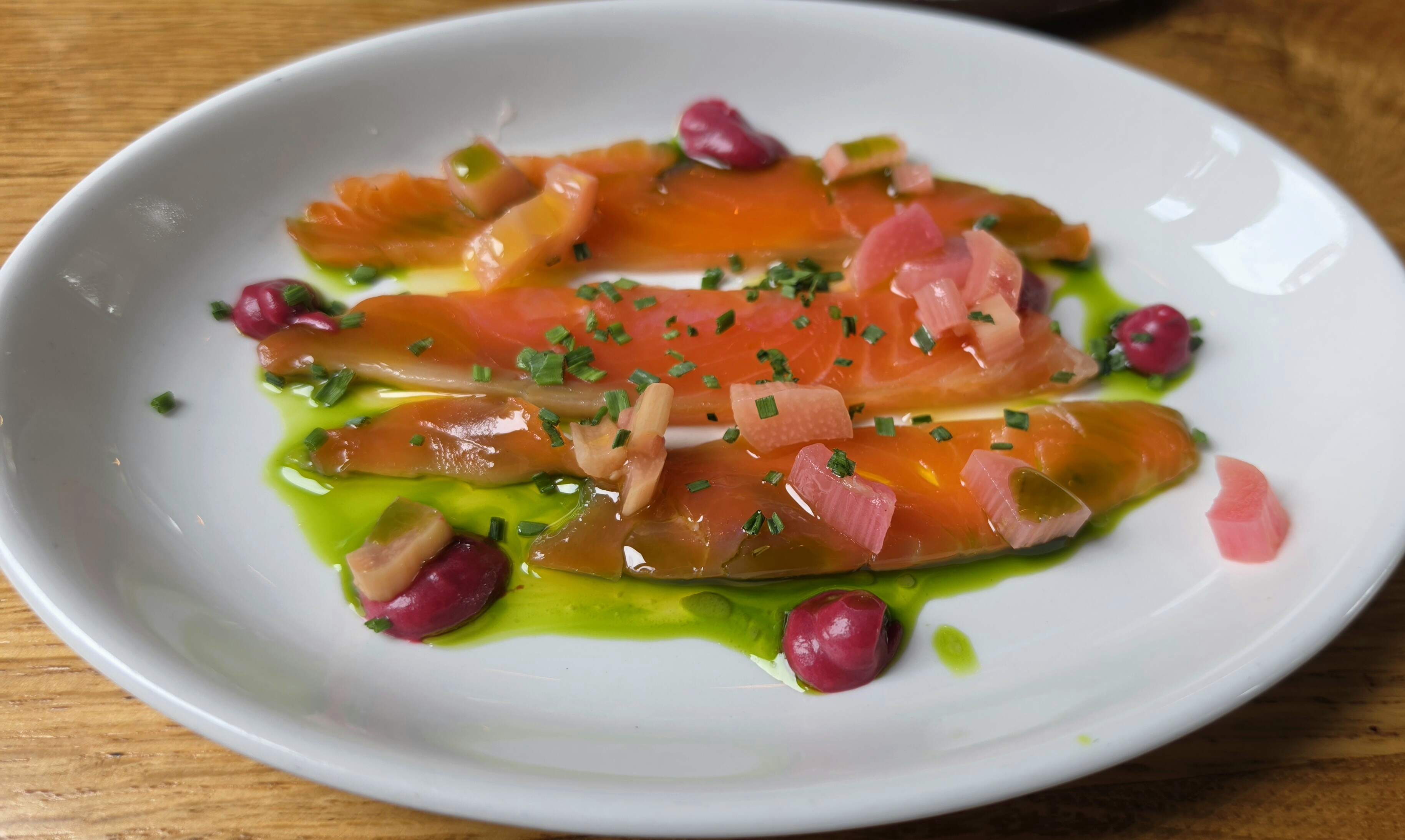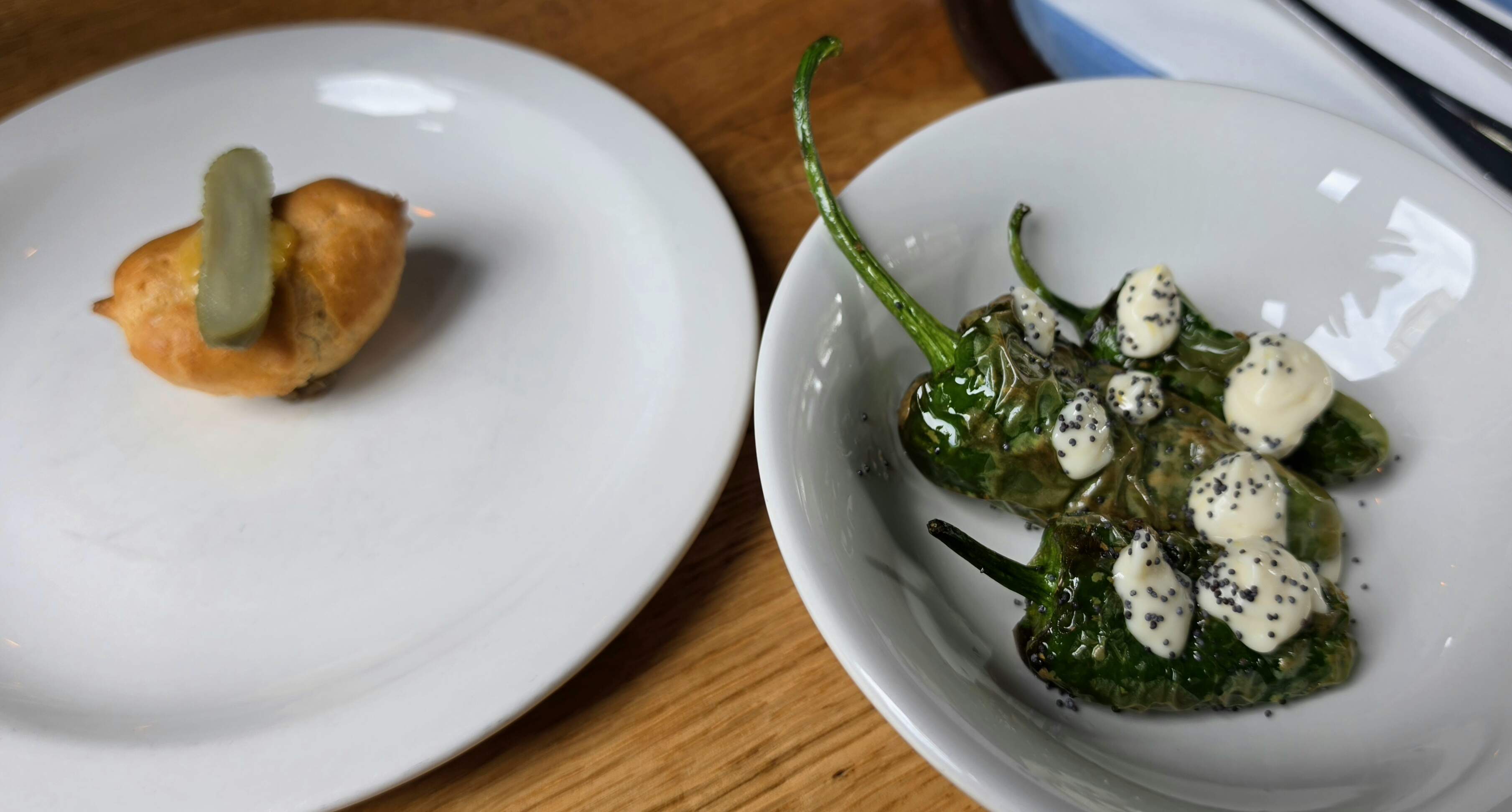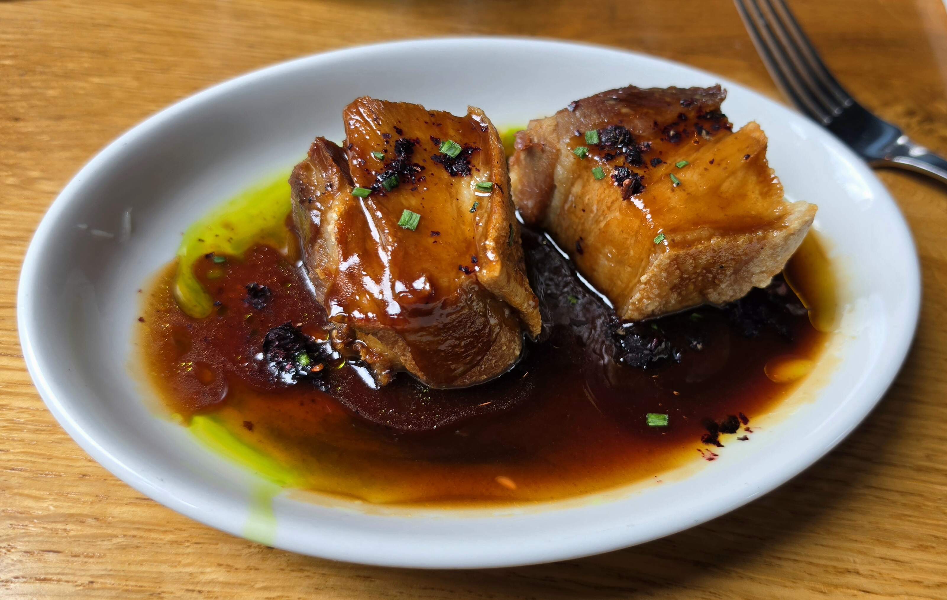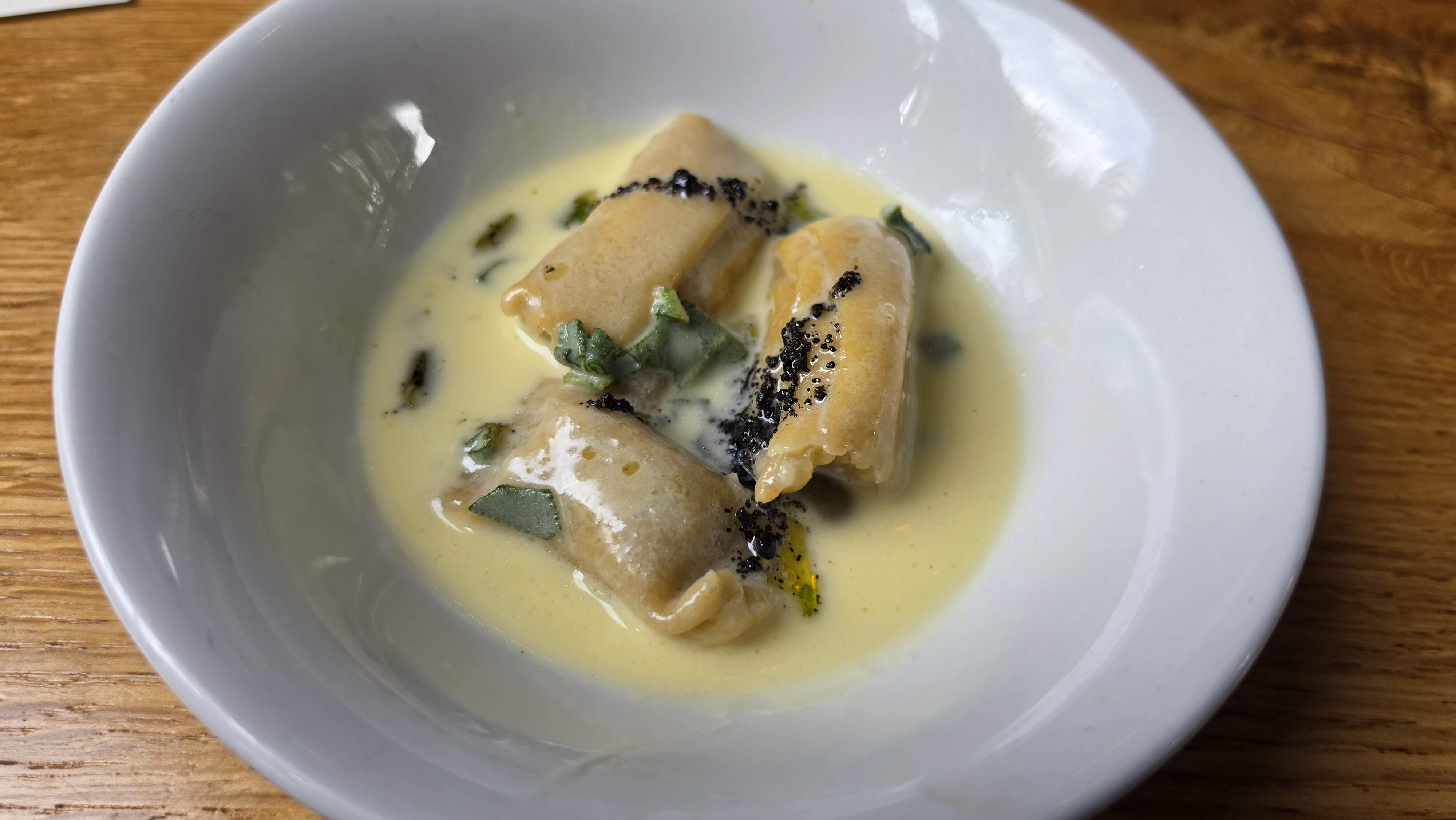 I returned to the Notting Hill area for a “Local and Wild” lunch tasting. Started with a tiny eclair, some rather nice Sussex Padron Peppers, moved on to a rather mundane smoked trout, a dish described as a Somerset Goat Cheese Agnolotti that I do not remember, an incredibly tough but rich pork belly that nearly got unintentionally ejected across the dining area and a rather nice bit of Sussex Lamb. And an Adnams Gin “Loosener” to tie it all together. Nicely done, The Shed!