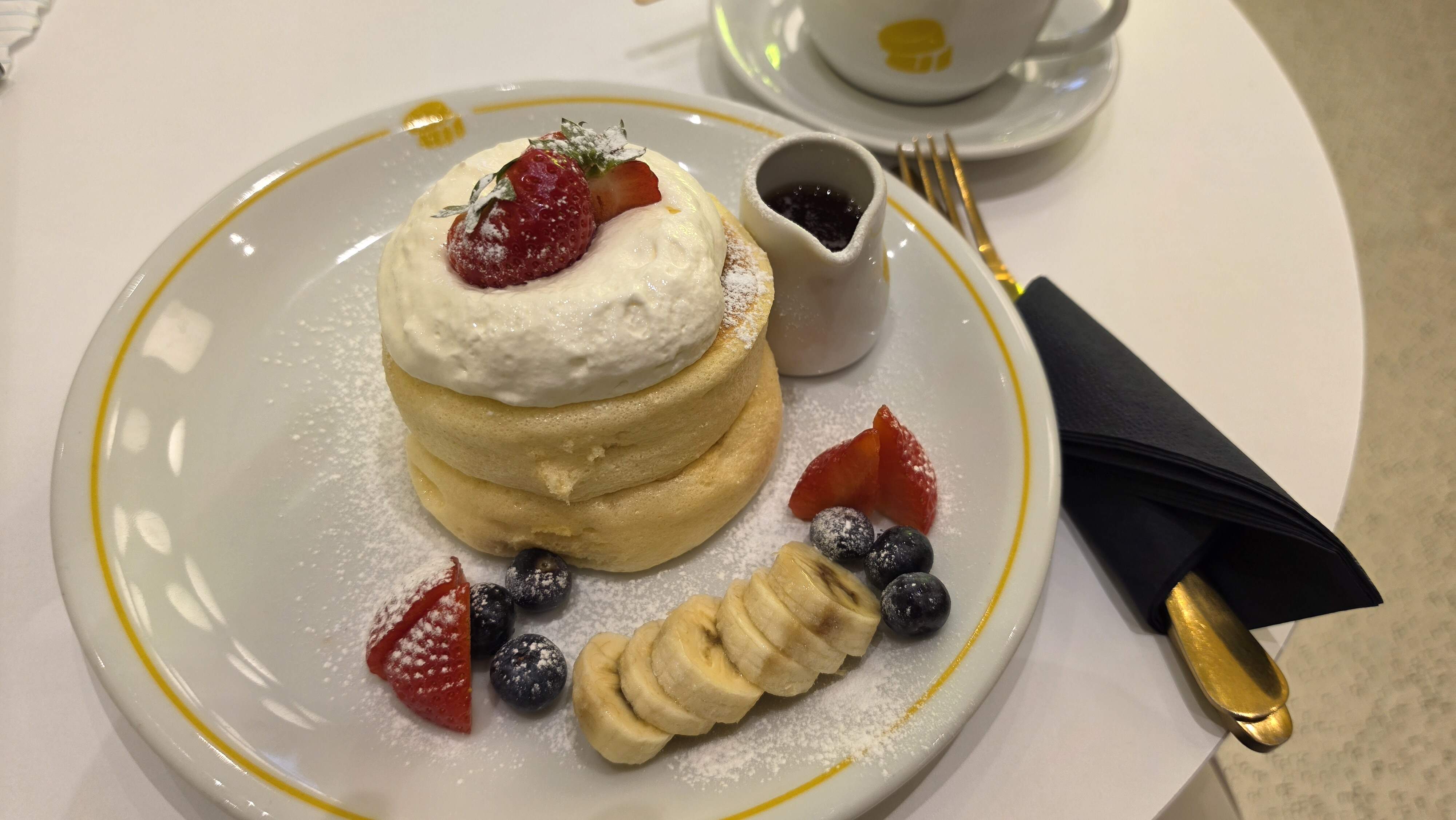 Then I slept for what seemed like days but was just 10 or 12 hours. And woke famished so I went in search of an English Breakfast with all the fixin’s! And ended up at Fluffy Fluffy, twice in two days, for souffle pancakes, first pistachio then the “Signature” with fresh (?) berries and bananas. And both were very, very sweet and good. And the coffees were ok as well. But this whole sweet breakfast thing is beginning to pull me in like some sort of addiction, it started in Chiang Mai and it is getting worse.