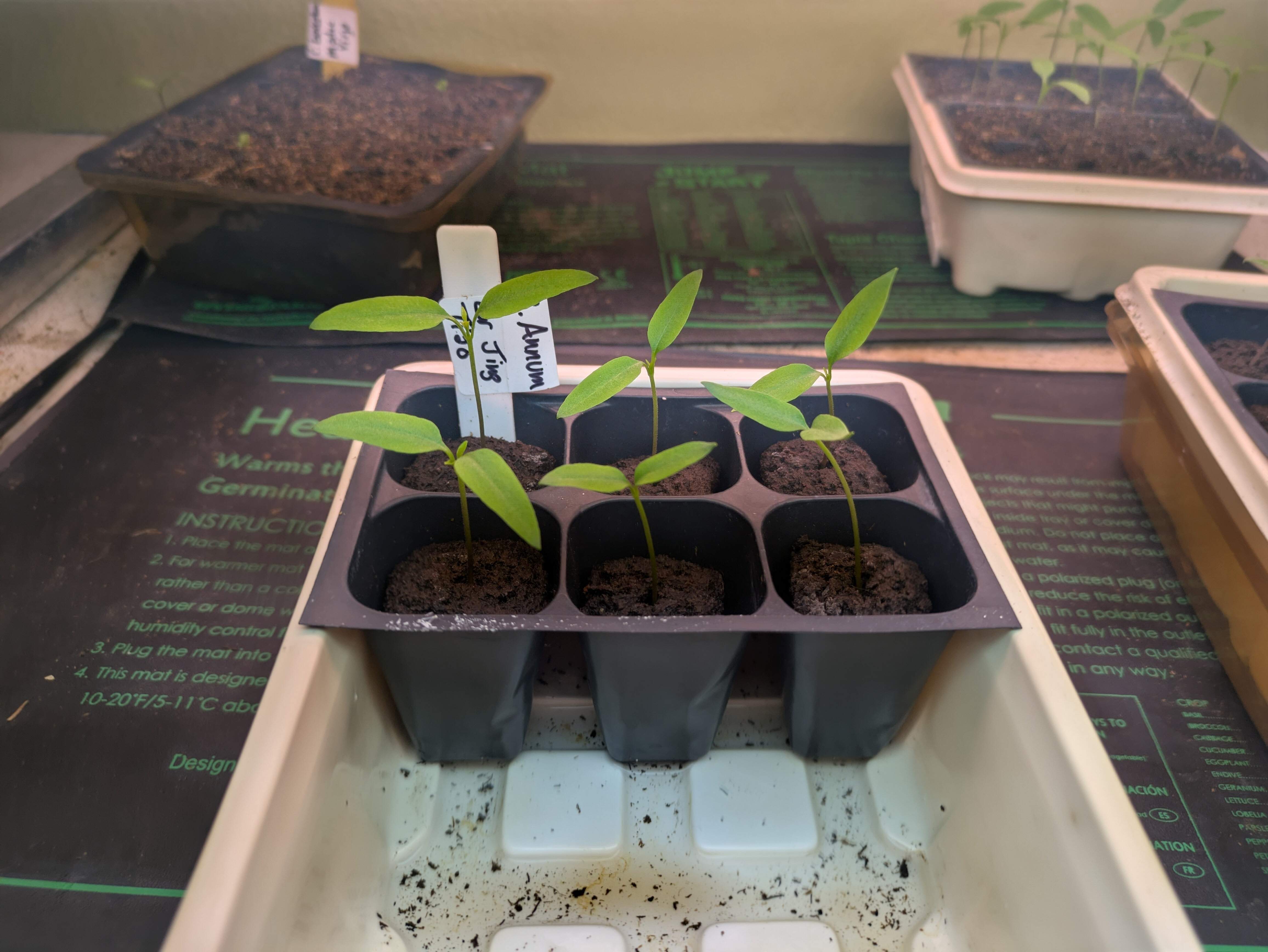 The plants are grown indoors until about late May. They do not get exposed to cold. During the 90-100 days, they’re under a powerful LED light, growing elevated over waterproof trays. The floor space is roughly 40 x 40 inches, roughly 11 square feet (3.35 square meters). By mid March, they’re often joined by other plants, like tomatoes. I tried to photograph it once, but the light is so powerful, it throws the phone camera into some sort of panic mode, even when I’m standing five feet away and the light isn’t hitting the camera receptor directly. The light setup is in the bedroom, which is usually vacant until night, when the light goes off. Heat mats are not usually needed once the plants are in 2 1/2 inch pots.