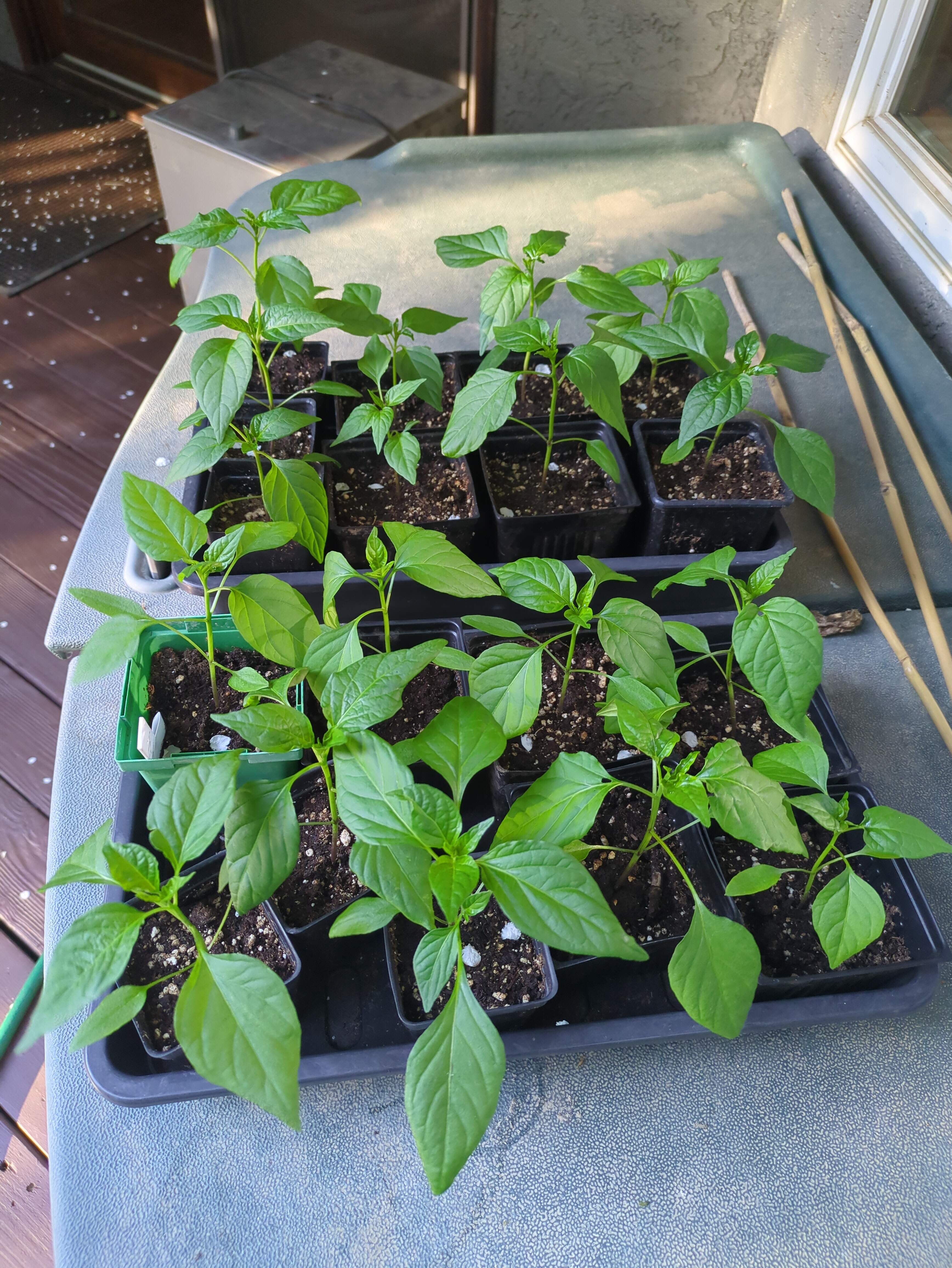 The peppers and other slower-growing starts begin in row-cells. Once large enough to handle/transplant, they go into 128 plug trays. Then into 2 1/2 inch deep pots (rose pots). If necessary, they get stepped up into 3 inch deep pots.