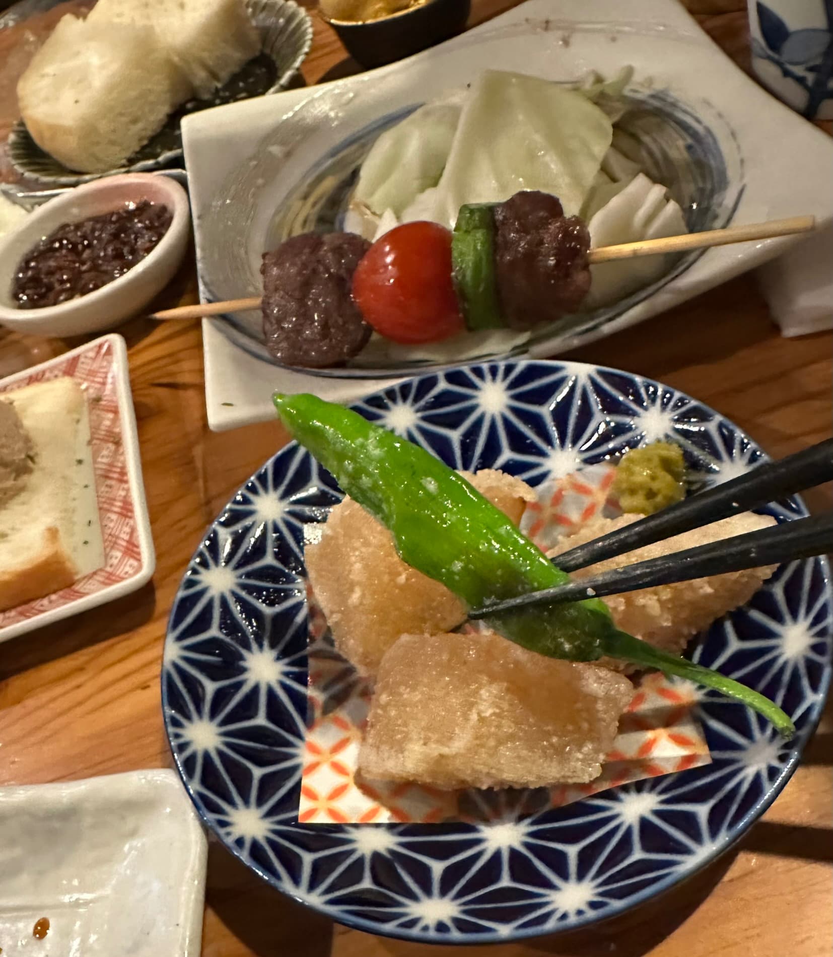 Soft tender Daikon, Preboiled in Dashi (ala Oden style), then lightly Breaded and Deep Fried. With a single perfect Shishito. A wonderful dish, we both agreed.