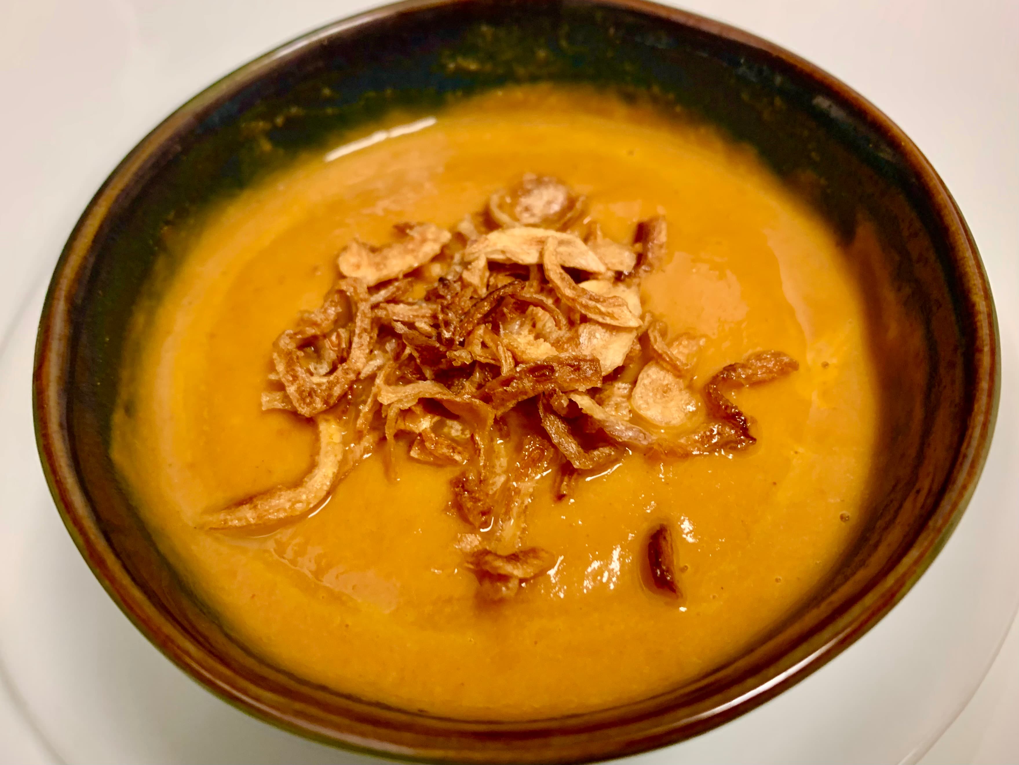 Topped with (purchased) fried shallots, which add a little texture and extra flavor when mixed through.
