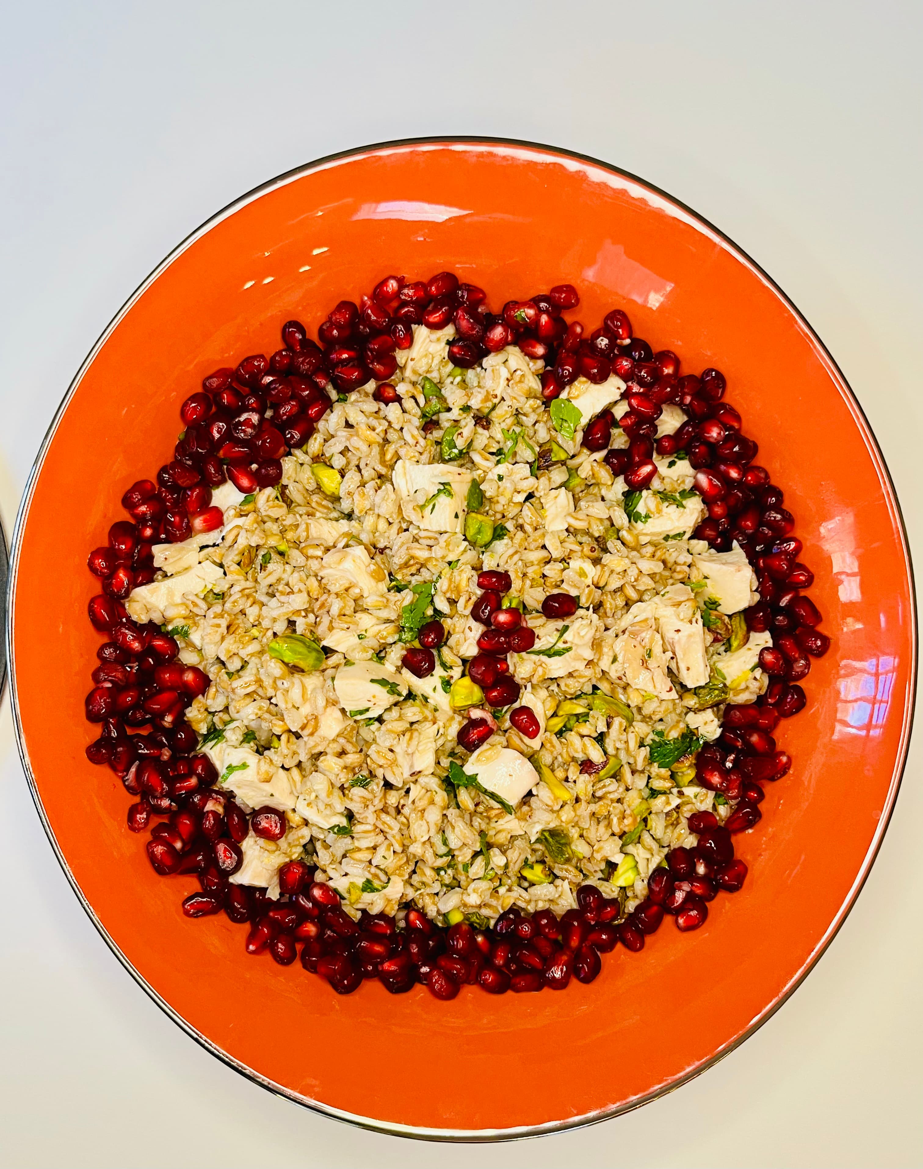 Thanks to @truman and @Saregama for posting the recipe for the farro salad with pistachios, pomegranate and apple. The apple hasn’t yet been added to the dish in this photo as I was waiting to add it just prior to serving. I added chicken breast chunks and a vinaigrette with Dijon and undetectable anchovies. This was a hit with everyone, I served toasted pita drizzled with evoo on the side.