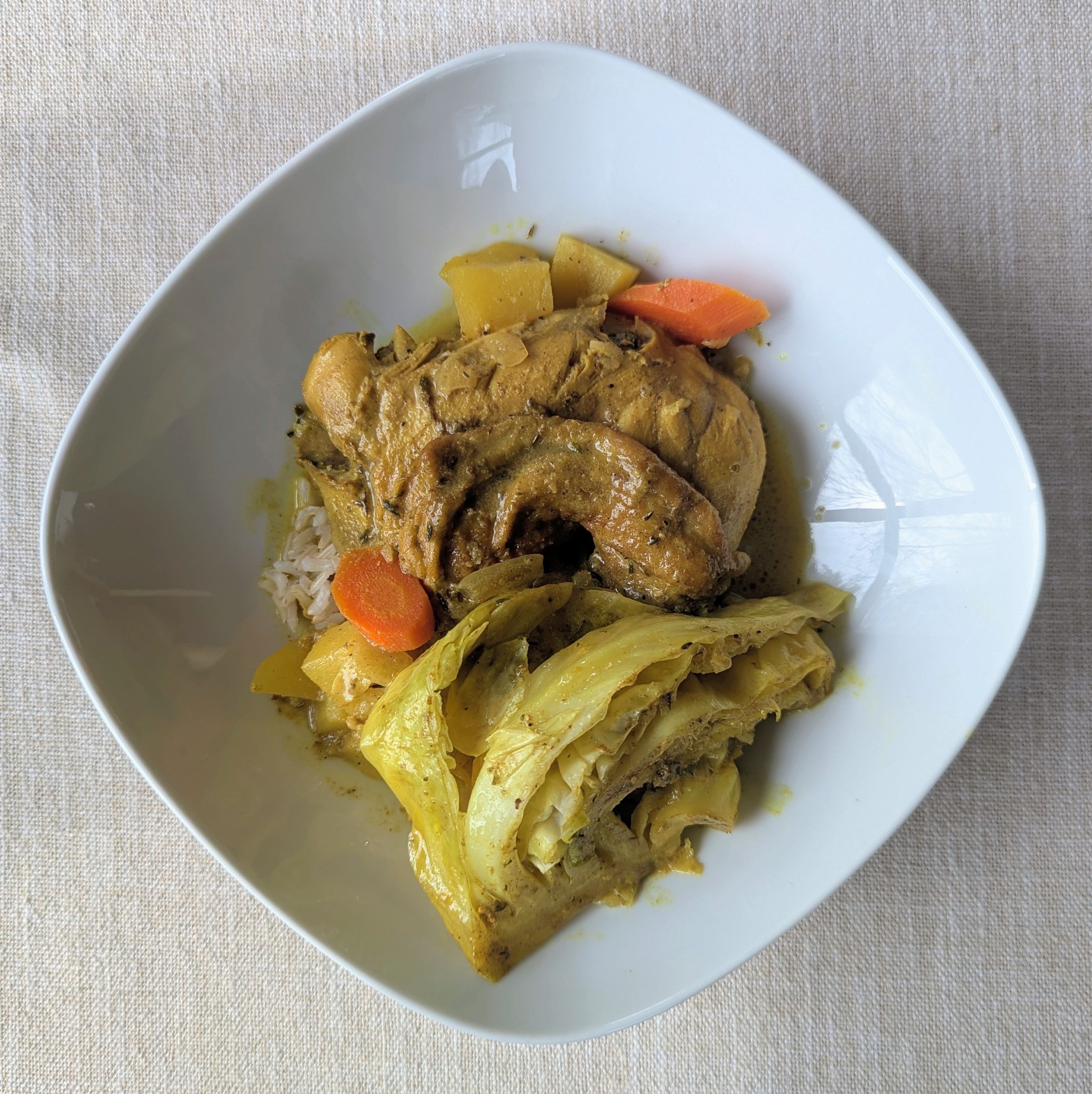 Tonight I made Jamaican chicken curry on @Zoeliculious ’ recommendation. I really liked it. I followed the recipe except for adding more carrots and potatoes, some cabbage wedges, chicken bouillon, a splash of soy sauce, and a bit more coconut milk. (Yes, this qualifies as me following the recipe .) Served over brown jasmine rice.
