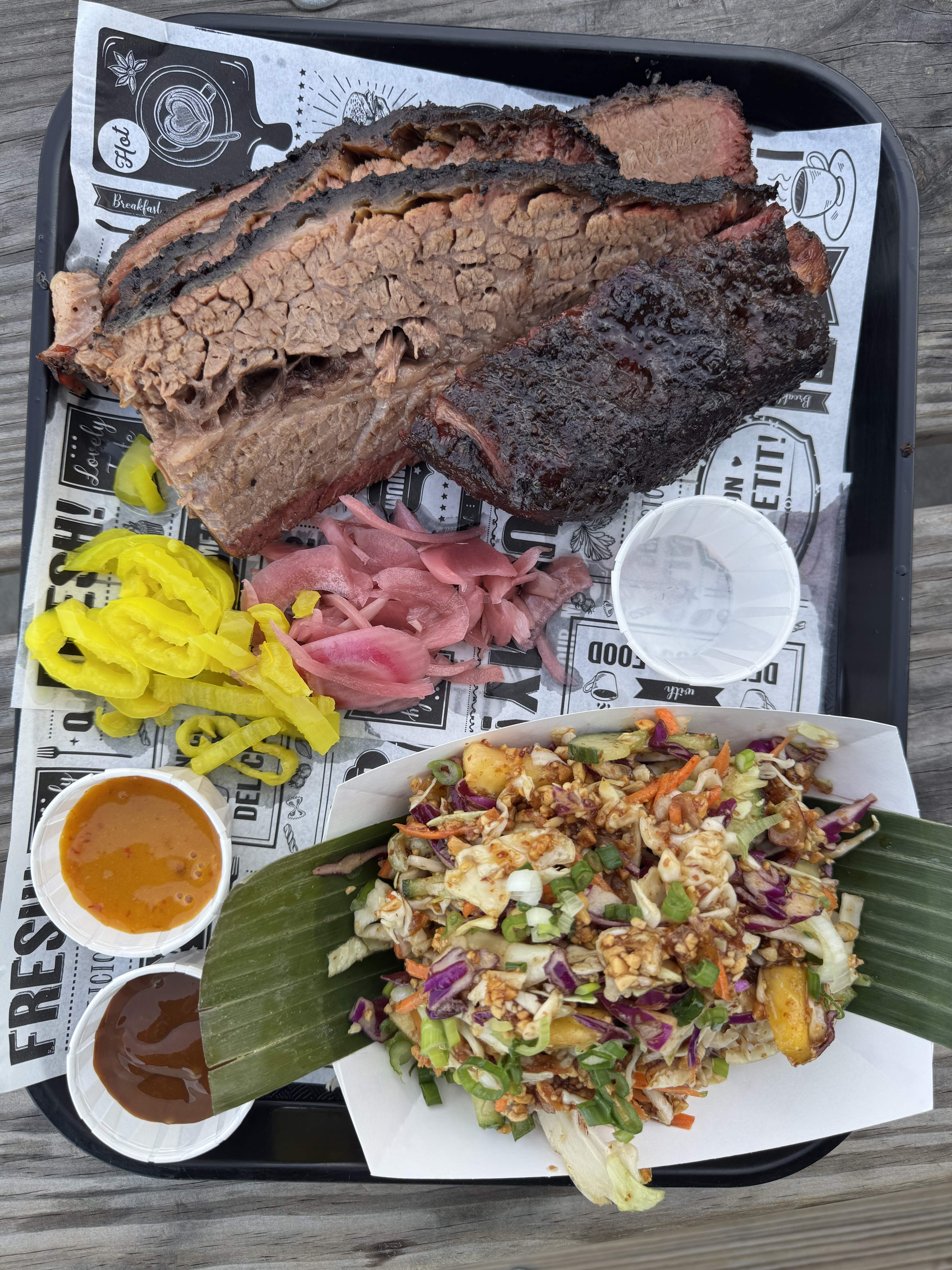 This place has gotten a bunch of buzz (Eater deemed it one of the best new restaurants in the US; NY Times said one of best 50 restaurants right now, etc.) and they are only open two days a week, so people line up before they open at noon. I got in line at 11:00 and there were about 20 people ahead of me (30 or so once their friends showed up). It was 12:30 when I ordered, so not too bad. The people at the front of the line had chairs and had been there since 10:00 (Franklin BBQ style), but nothing was sold out when I ordered, and the line wasn’t crazy when I drove by at 1:00, so I don’t see any reason to get there super early. They bring around samples of brisket to the line which is a nice touch.