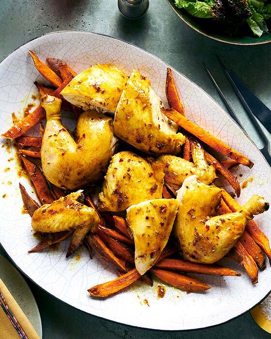 Zuni-based roast chicken: salt all over, refrigerate overnight, warm to room temperature, slip some butter under the breast skin, and into the oven at 550F. It cooks quickly, so keep an eye on it.