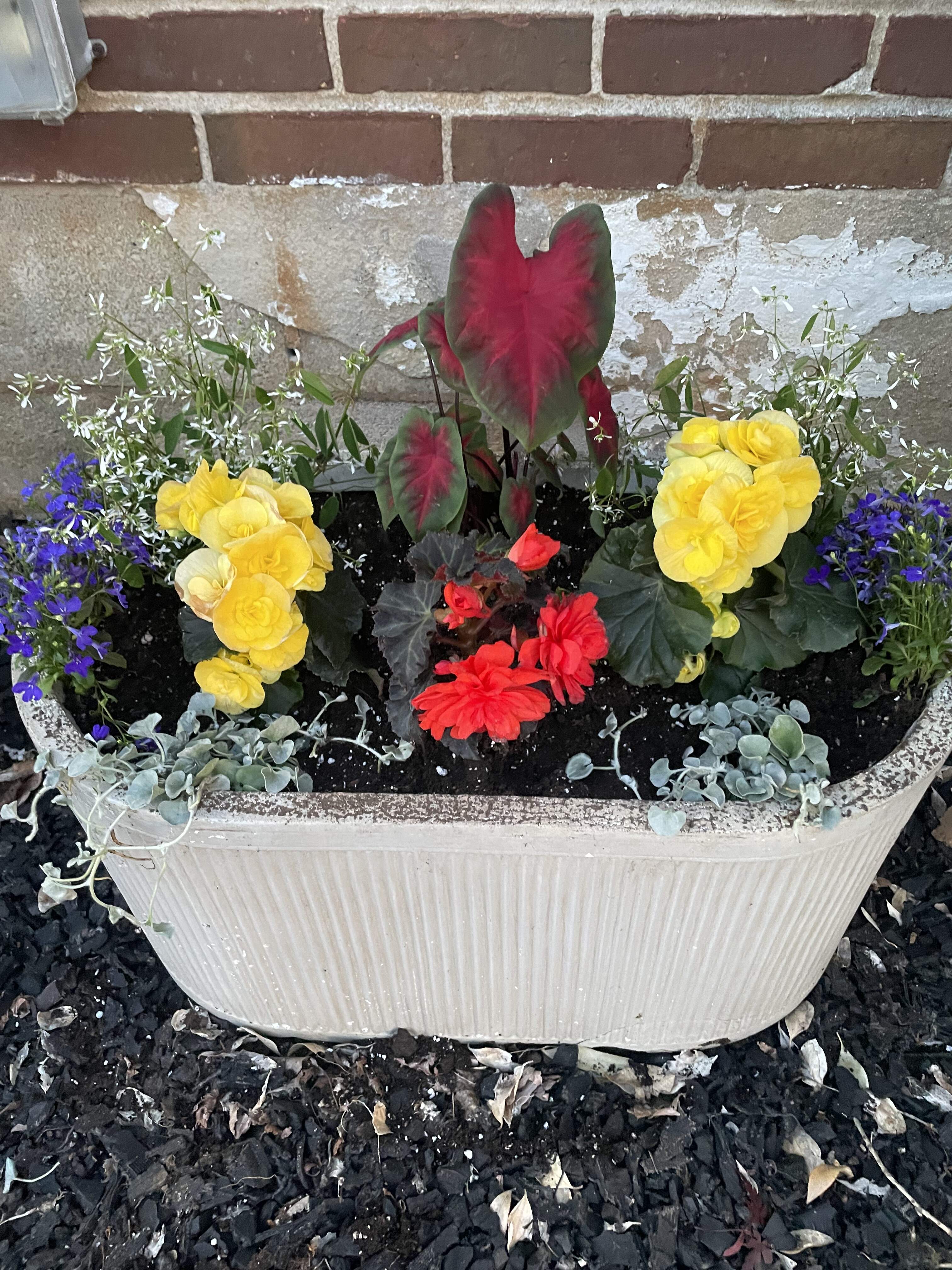 Every year I create two big matching planters of begonias and some other shade plants for the front of the house. Today I put them together.