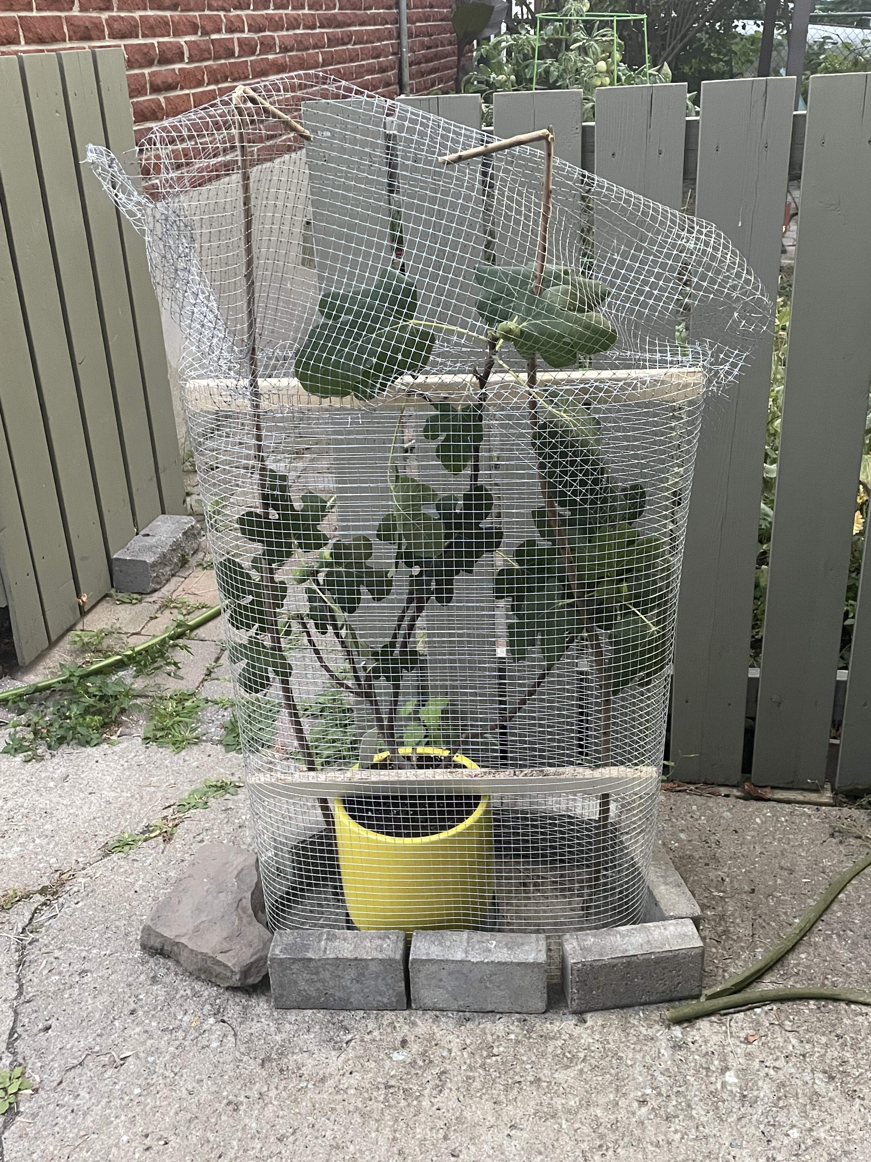 I spent some time yesterday evening making a jail for my fig. Squirrels have been eating them all, and I had to move it inside but it stinks. I had it in the back porch, but it made for a very unpleasant entry in the hot weather. I used metal and then plastic at the top and sewed them together with wire. Fingers crossed this works!