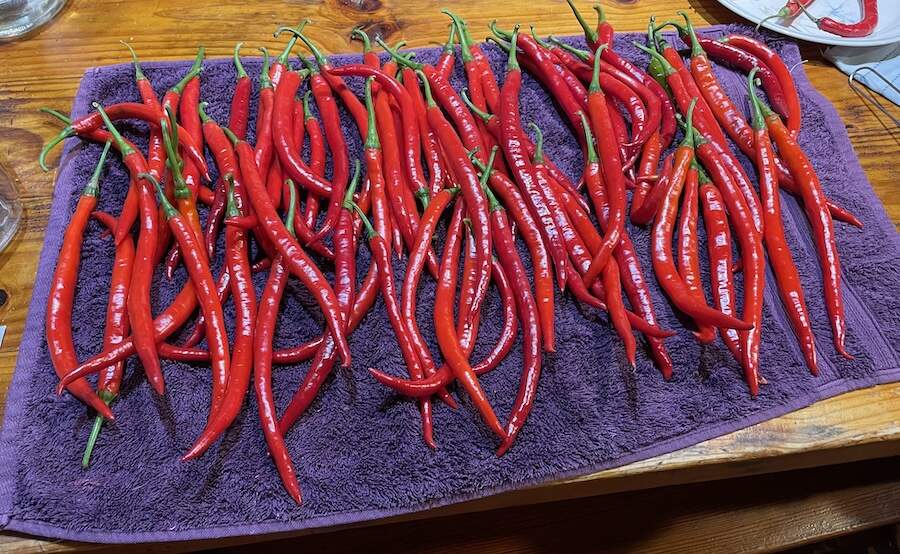 Once the peppers are about 2/3 dry, they go into a dehydrator set at a low temperature: 100–110°F, 38–43°C. When flexible-dry, they develop more umami type fragrances, along with the pepper aroma. I’ll know if this method is correct the next time I make Sichuan style chili oil.