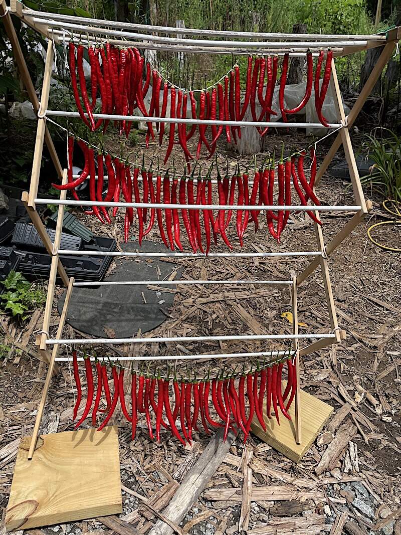First, sun-dry the peppers unti lthey are quite wilted, but before the sun bleaches them. Here, rains have been coming every evening. A way to get the peppers out and in is necessary.