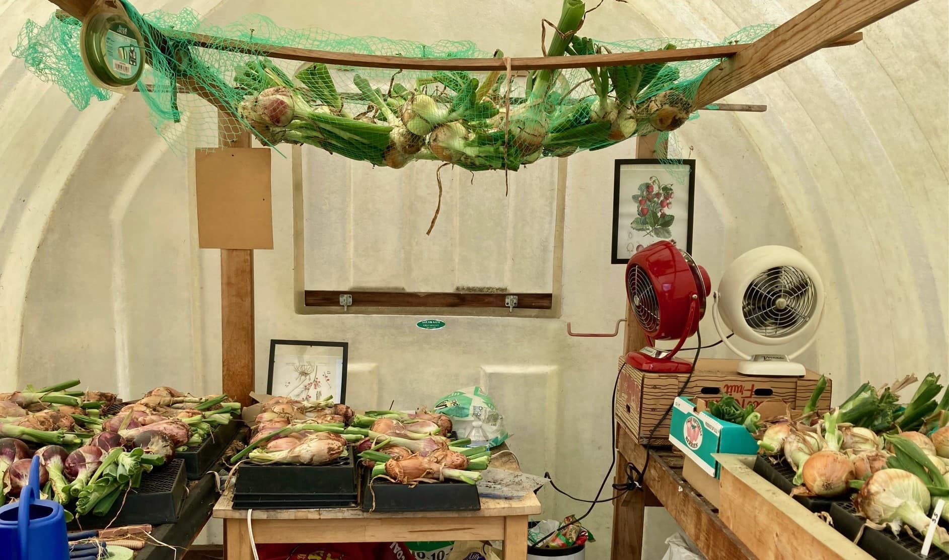 Curing onions and shallots in the green house. These will last us until sometime in the late-winter/early-spring.