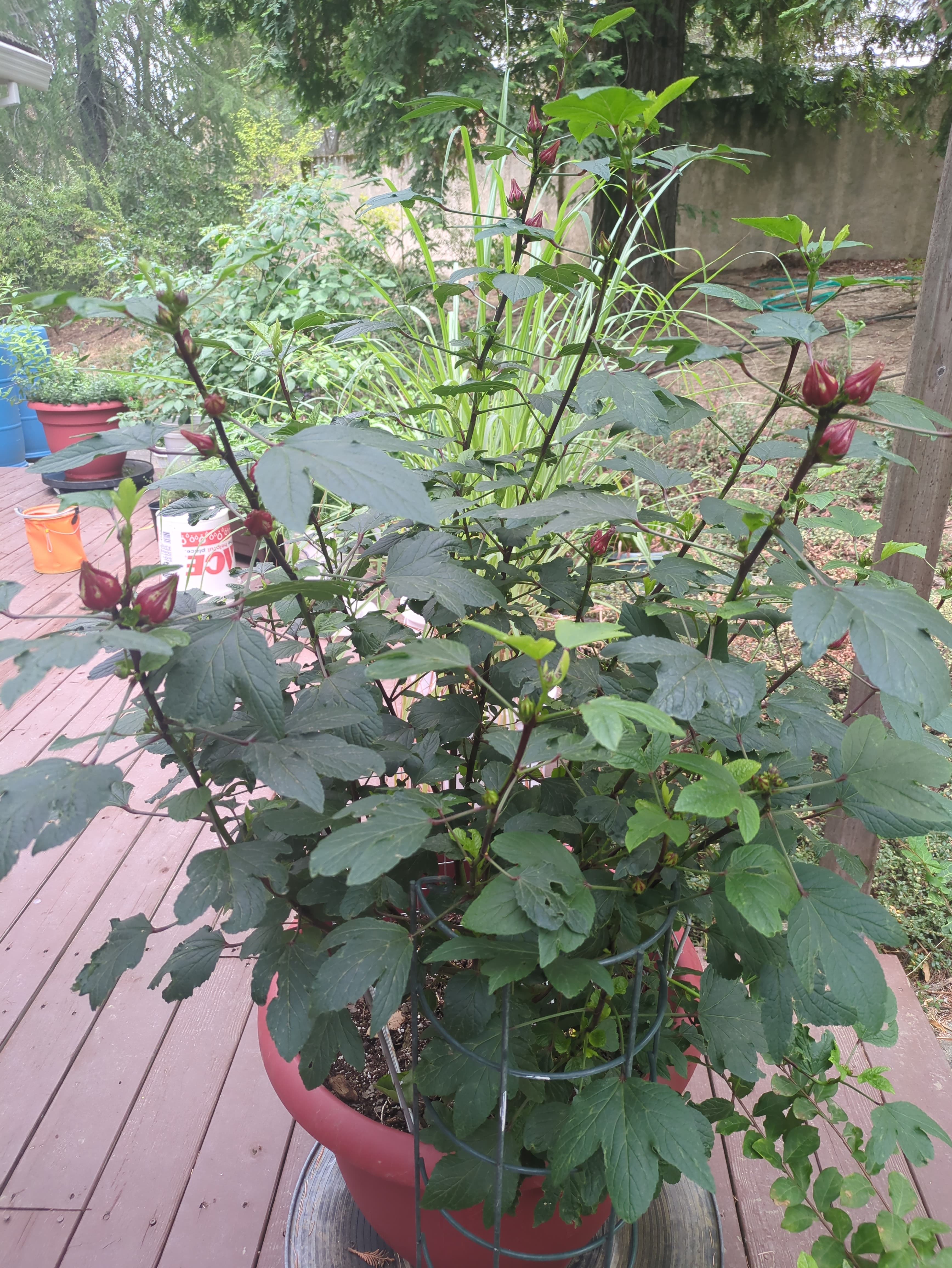 Also my first time with “Roselle” ( Hibiscus sabdariffa, aka “Jamaican sorrel”), @bogman s lemongrass behind.
