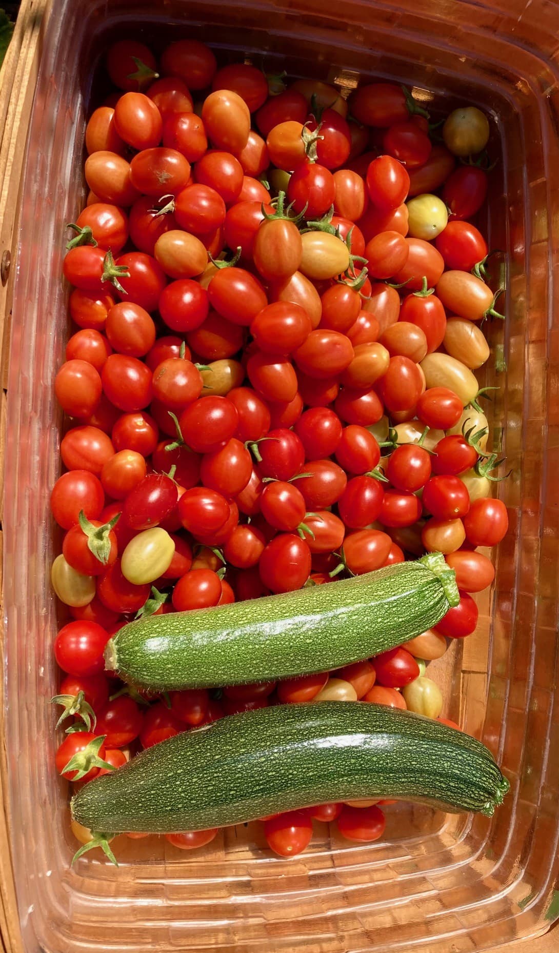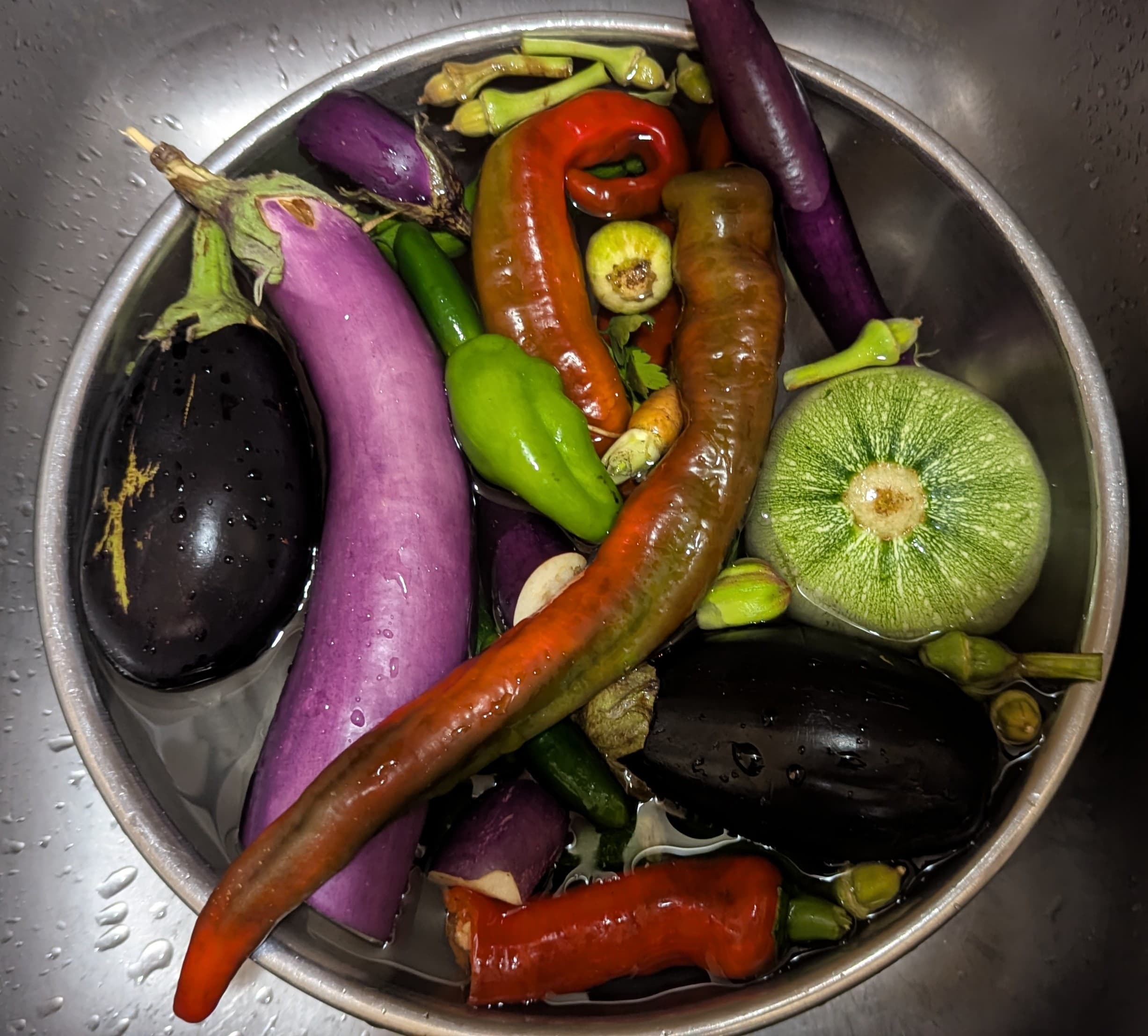 Cucumber plant long gone (i have 1.5 cucumbers to eat still, in the fridge.) Shishito and bell pepper plants very reserved this year. I still have a couple small poblanos growing; hoping they’ll get bigger before first frost.