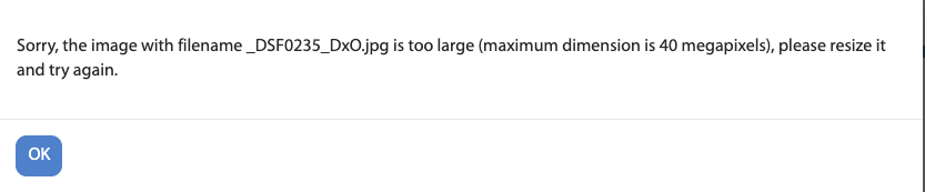 Have the photo upload parameters been changed? Uploads have been slow and I got this message trying to upload a jpeg, I tried again with a jpeg I successfully uploaded previously and get the same message. FWIW this picture is a 40mp jpeg (7781x5152) which is the native image size of the camera I used to take it.