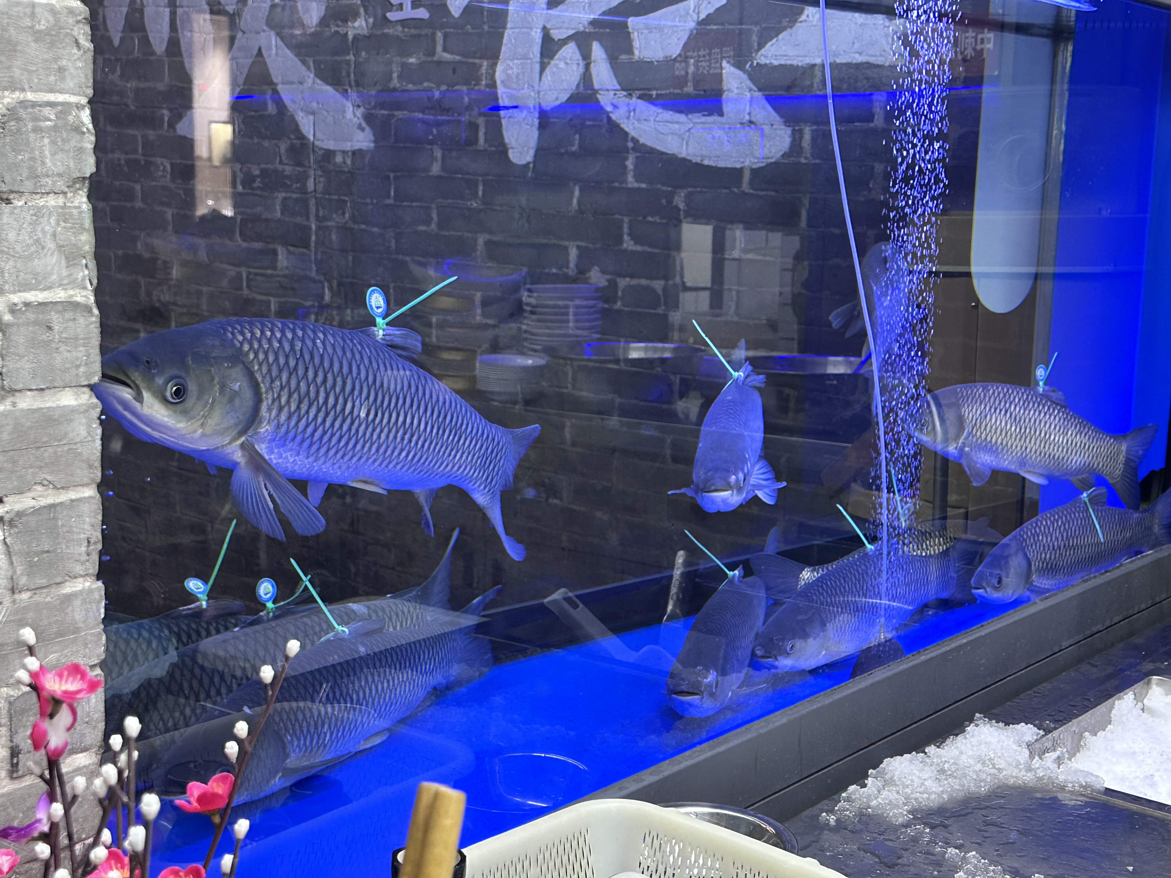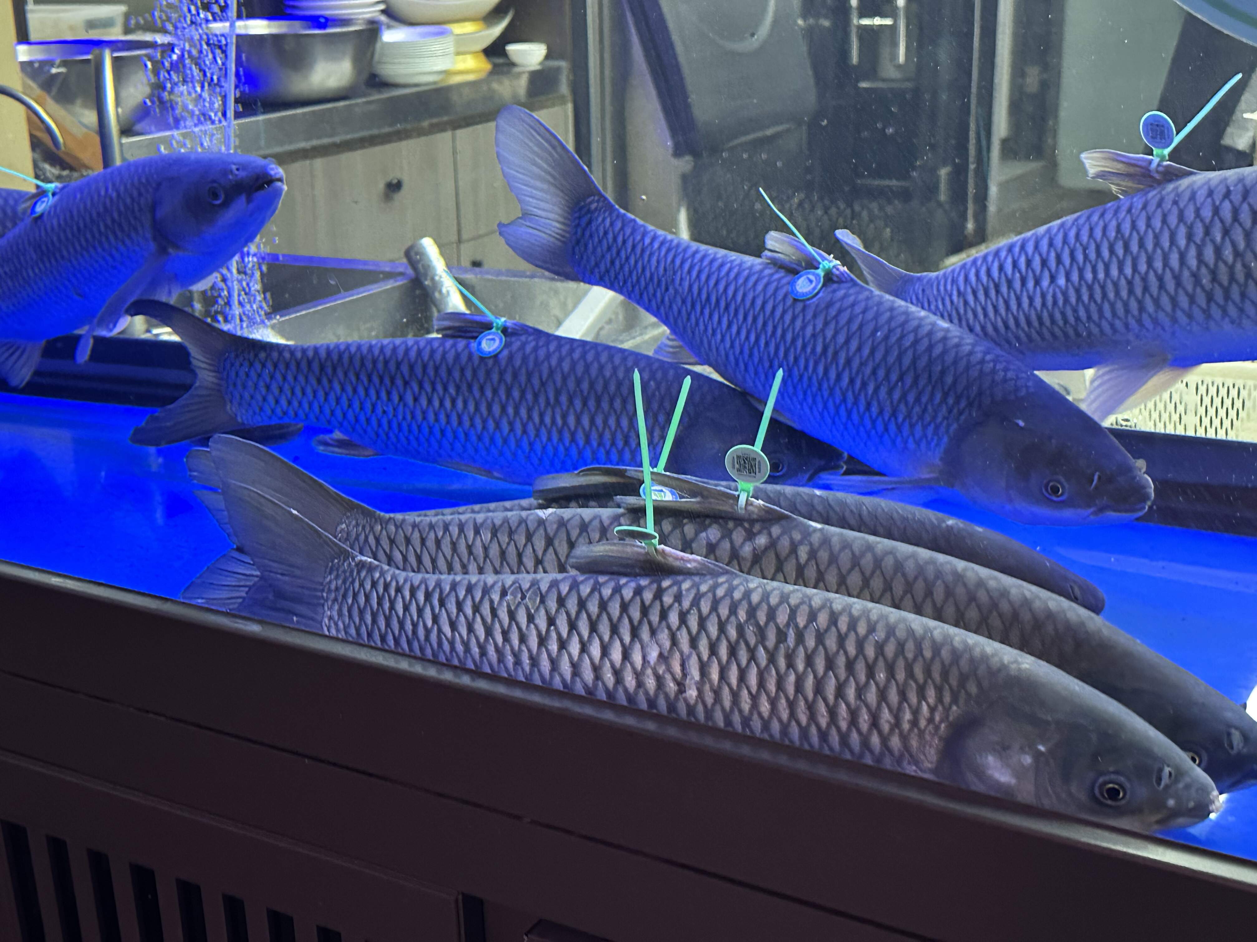 Crystal clear filtered water. Perfect spread out fins and clear eyes. Each fish tagged to confirm and certify organic and pesticide free upbringing from roe to table.