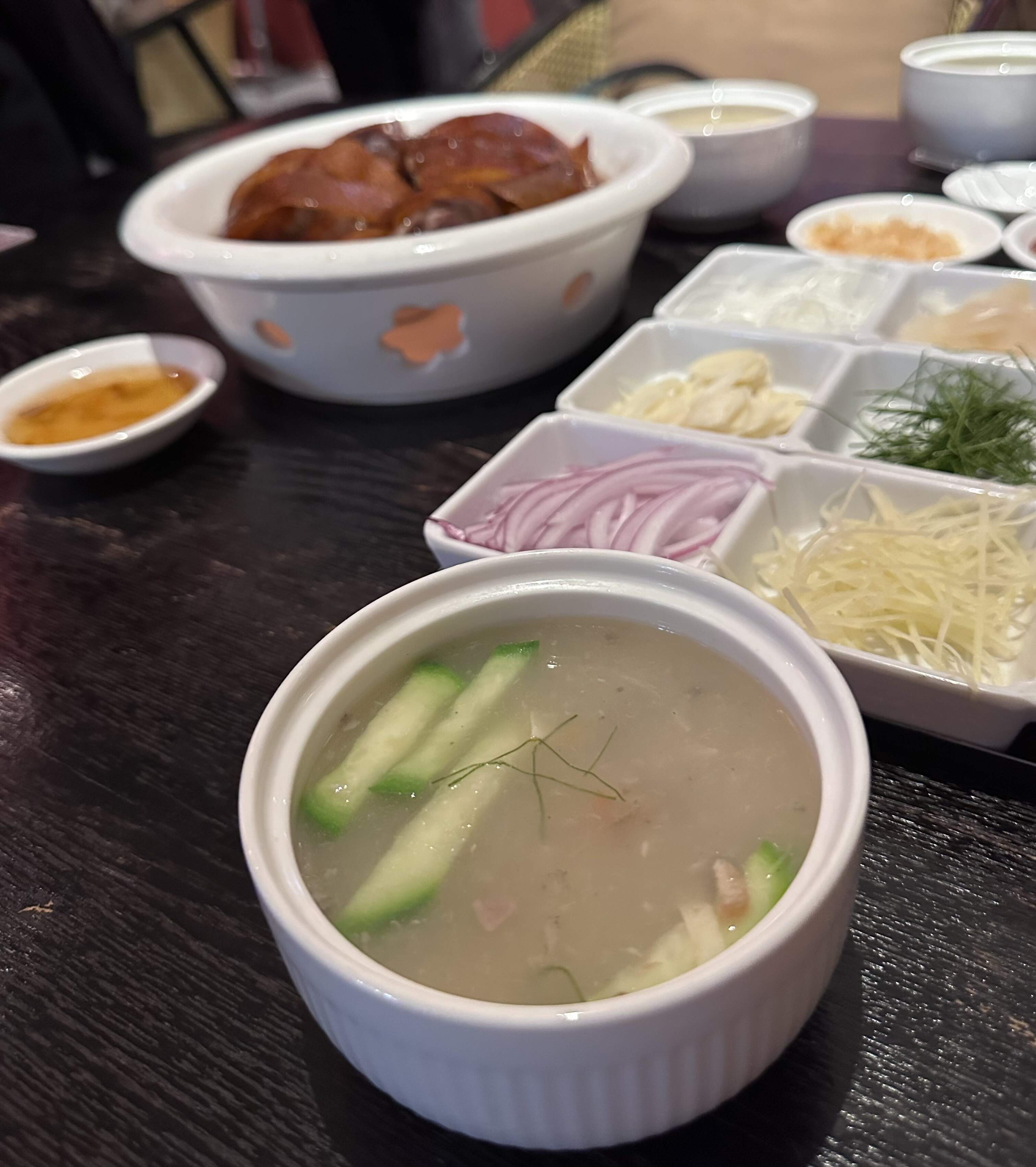 Served with requisite accouterments: Onion, Shallots, Ginger, Roasted Peanuts, Dill, Taro Shreds +++