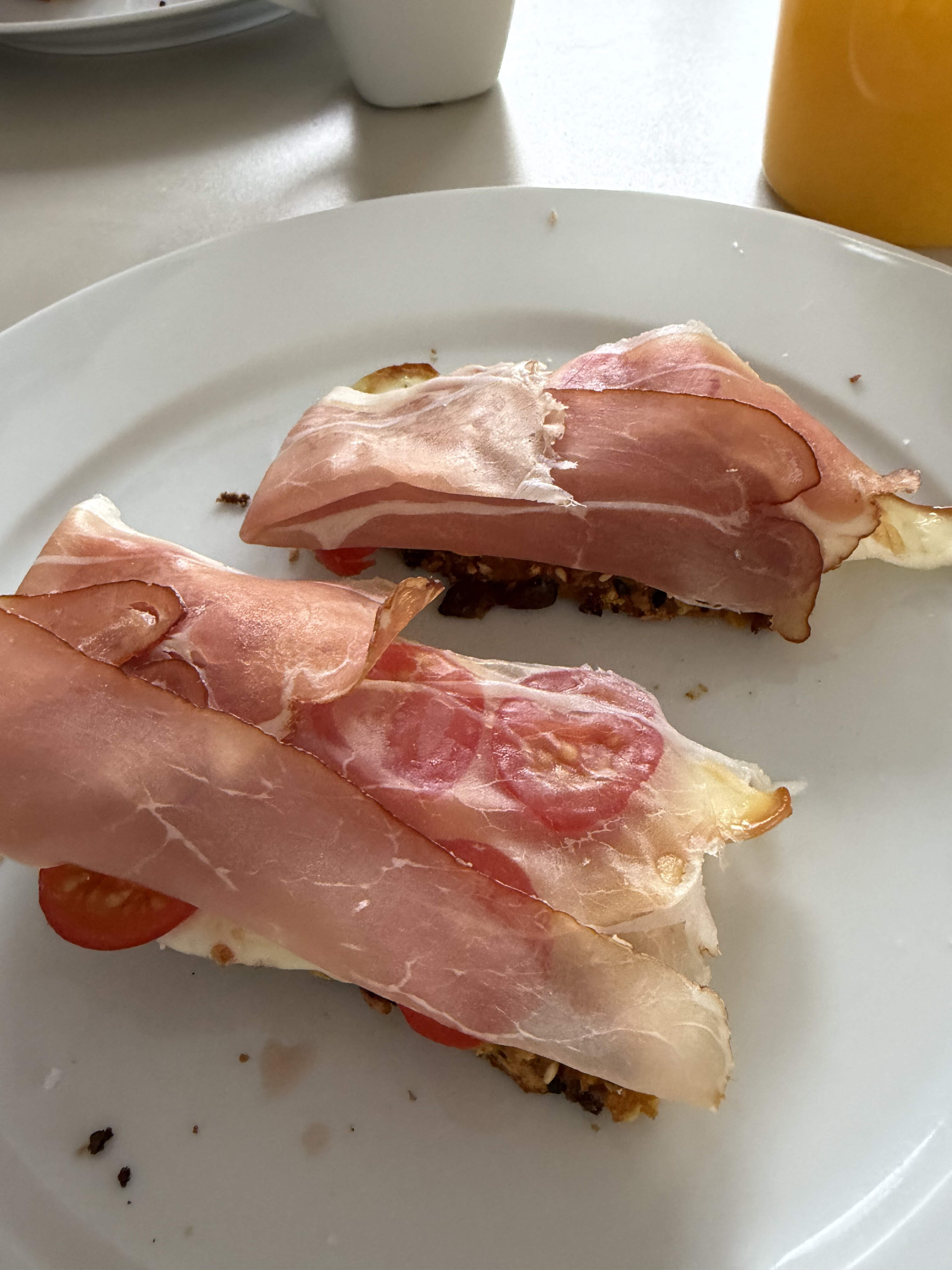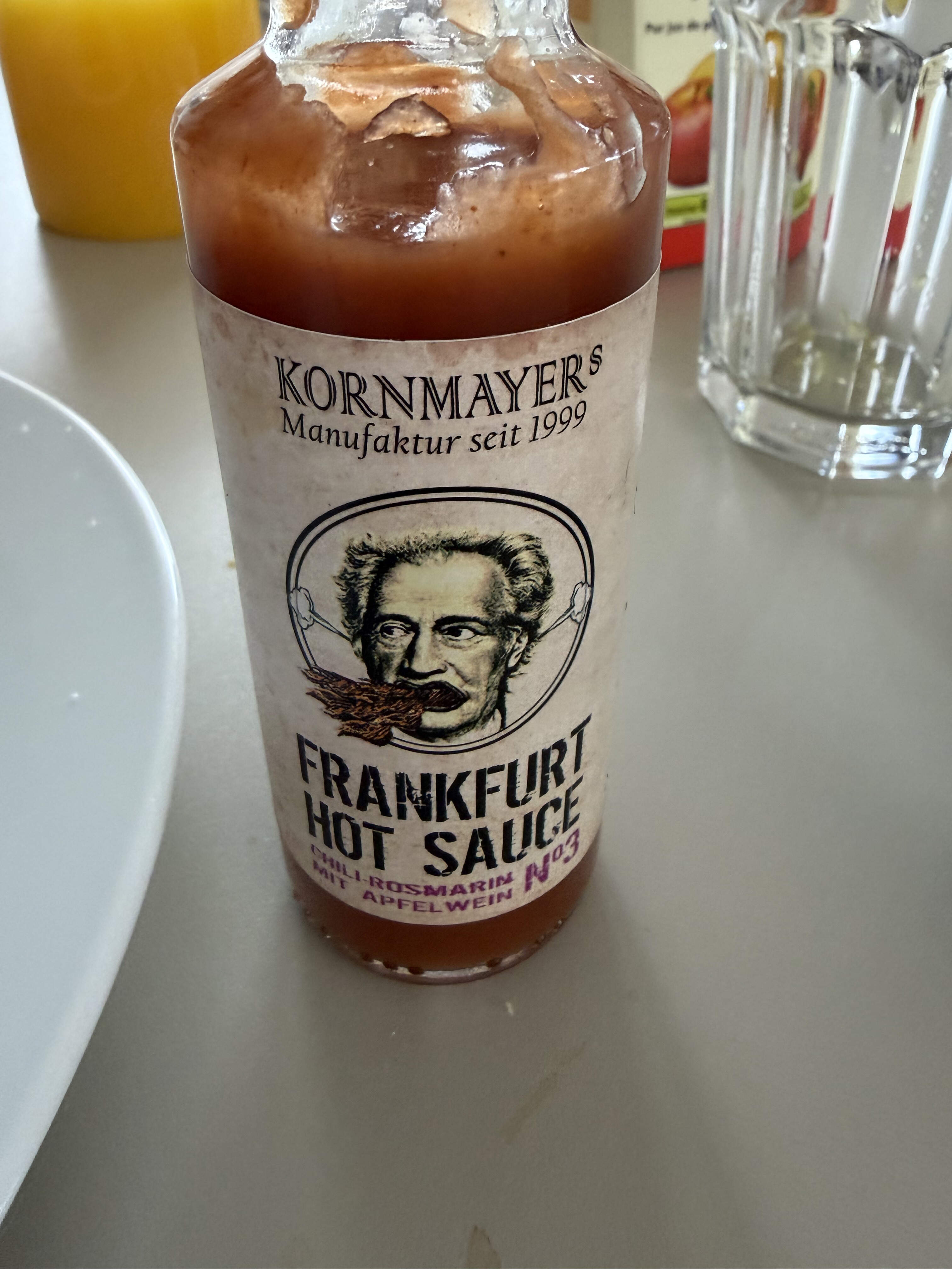 Fortifying ourselves for a day trip to Heidelberg, the schloss, funicular etc. A late Saturday morning breakfast sandwich of toasted bread from Lautenschlager, kÀse, fried egg - beautiful free-range eggs from the wochenmarkt - sliced cherry tomato, a schmear of Frankfurt hot sauce (mit apfelwein!) and topped with Schwarzwald schinke.
