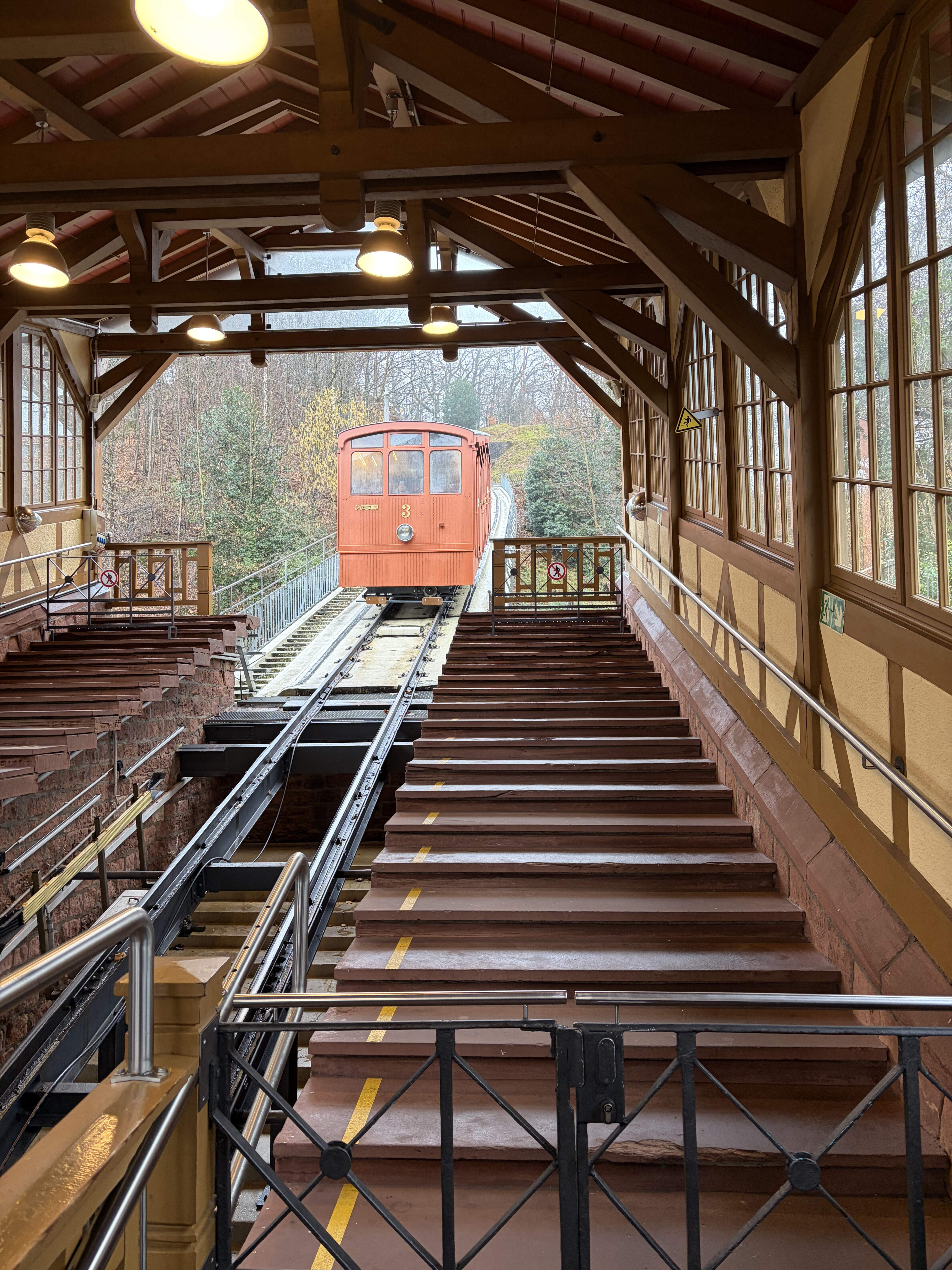 The rain dampened our enthusiasm for walking around the old town and the bridge, so we parked near the kornmarkt and took the funicular up to the schloss. A guided tour got us out of the rain. The hour-long tour was pretty entertaining and informative thanks to our guide. Afterward we continued up the mountain in the funicular, changing from a modern one to a vintage funicular for the last leg up to König Stuhl. A US colleague who has a house in Heidelberg recommended the restaurant Bergstube at the Berg-Gasthof. It turned out to be just steps from the funicular station. The room is all blond wood with a slightly alpine feel, and a few alpine dishes on the menu (raclette and fondue) cement the first impression. A starter of assorted German sausages (and a hefeweizen with more body that a typical hefeweizen) was a highlight. One of them was called âchimney rootâ â I have no clue what that means. Schnitzel with sauteed onions, schinke, and raclette for me, and pot roast for SO were serviceable but not particularly noteworthy. But the room was pleasant (warm and dry!), the service efficient and solicitous, and getting there on the funicular was great fun. It supposedly has a nice view overlooking the schloss and Heidelberg, and though we had a window seat the view remained a rumor.