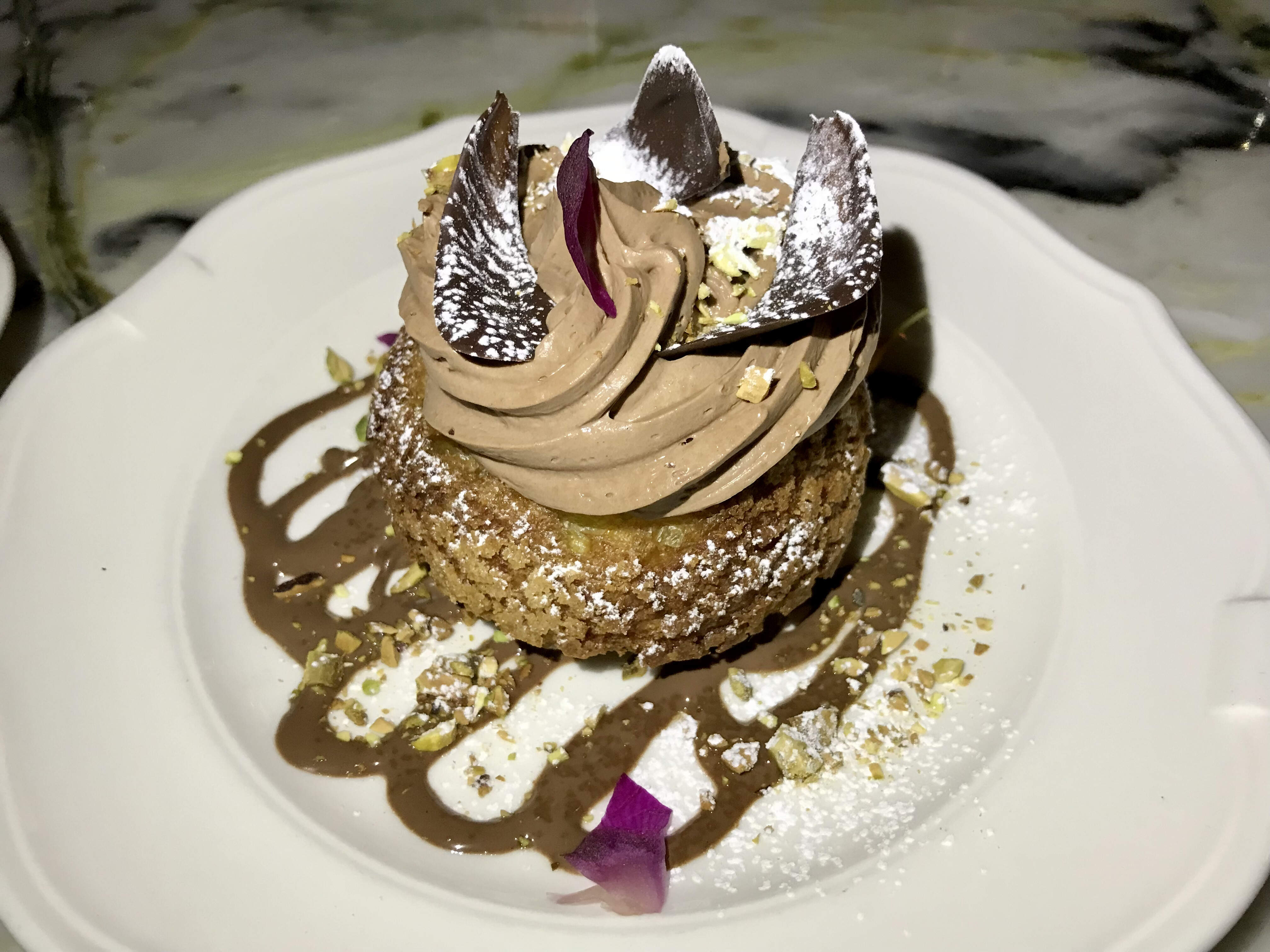 For dessert we split a profiterole, filled with a not-too-sweet dark chocolate ganache, and dressed with toasted pistachios and chocolate sauce. Good, not remarkable.