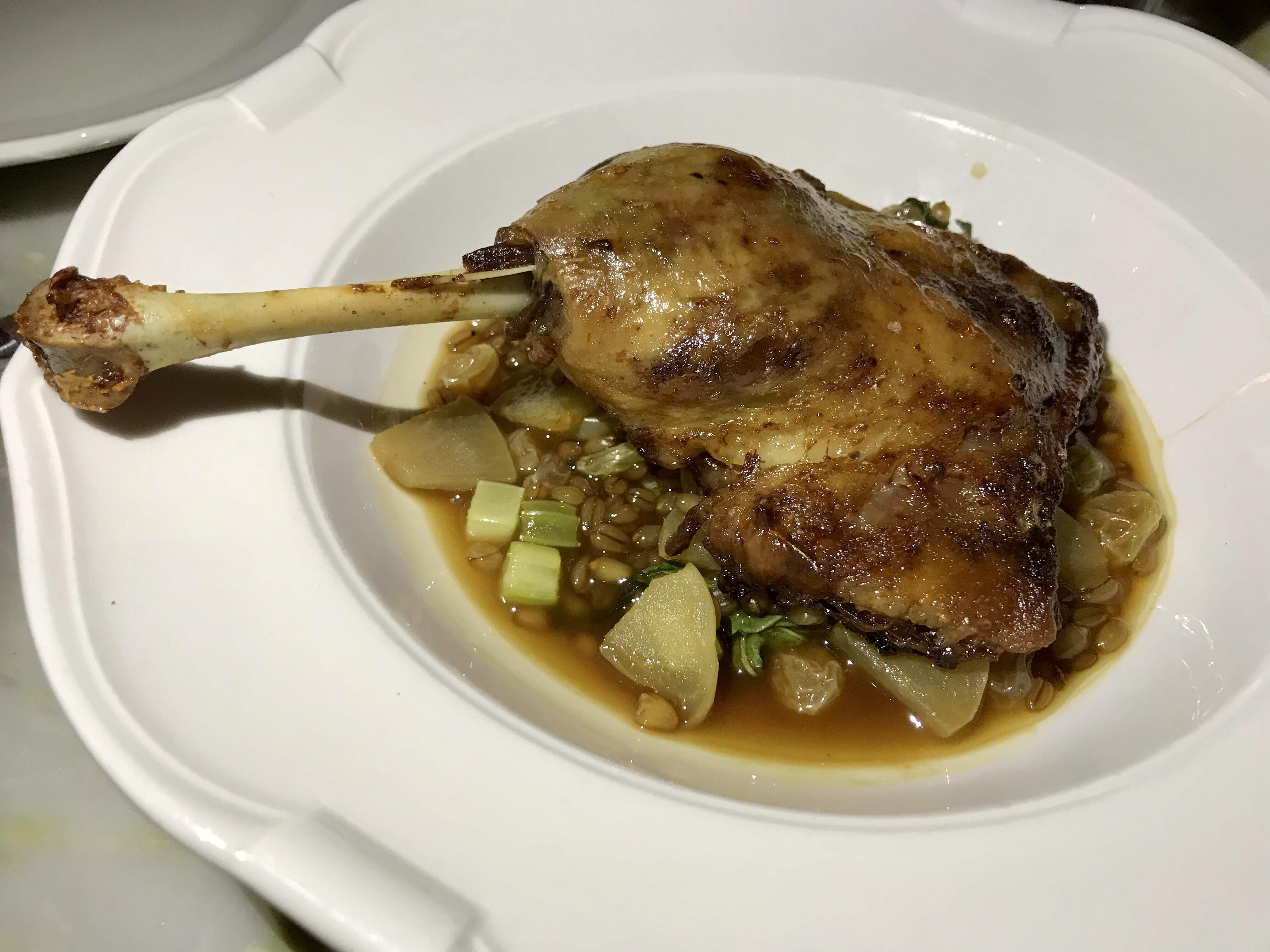 Duck confit was more successful, with crisp skin and moist meat, served with braised wheat berry, raisins, celery, compressed (pickled) apple, and swiss chard.