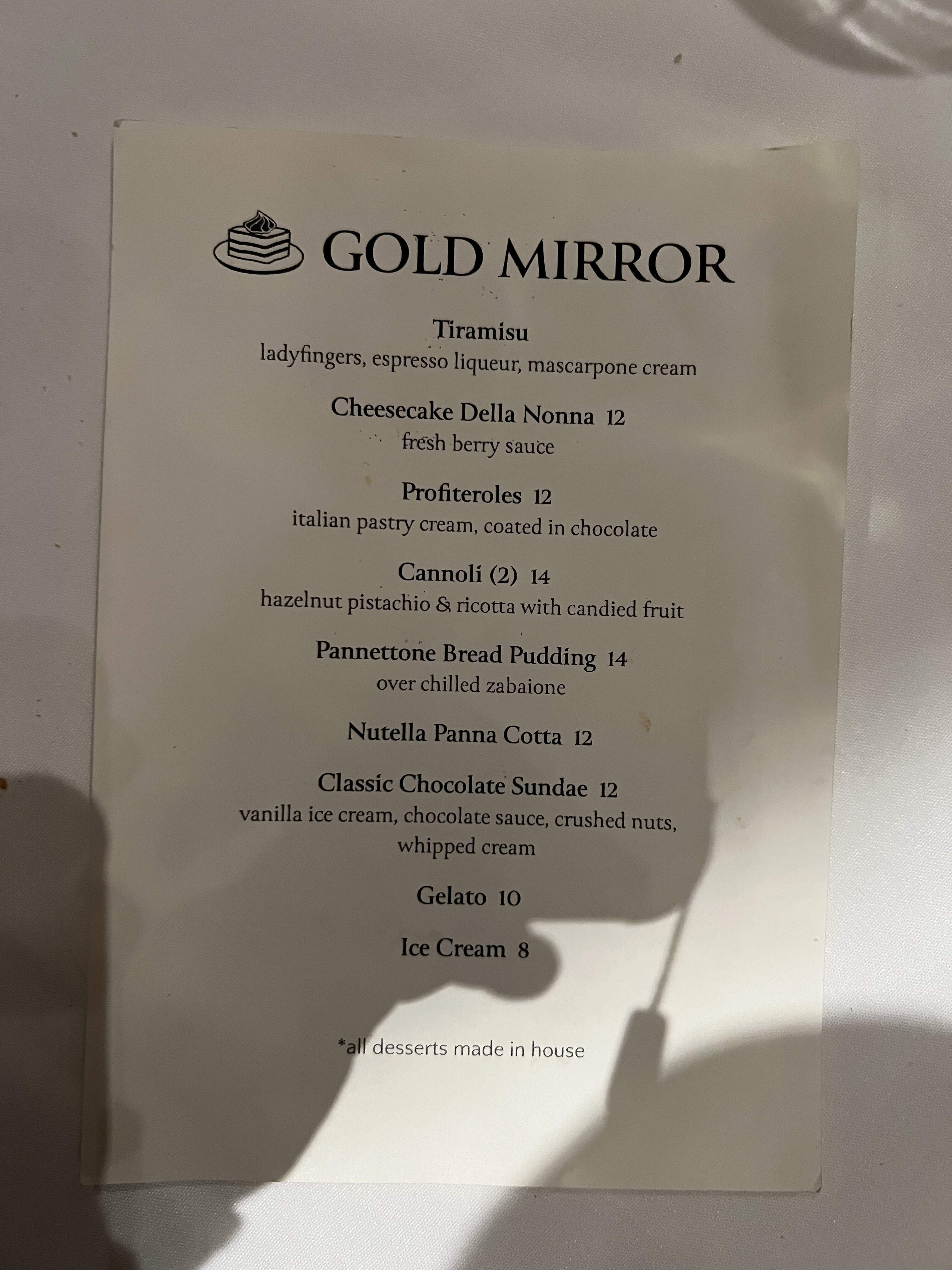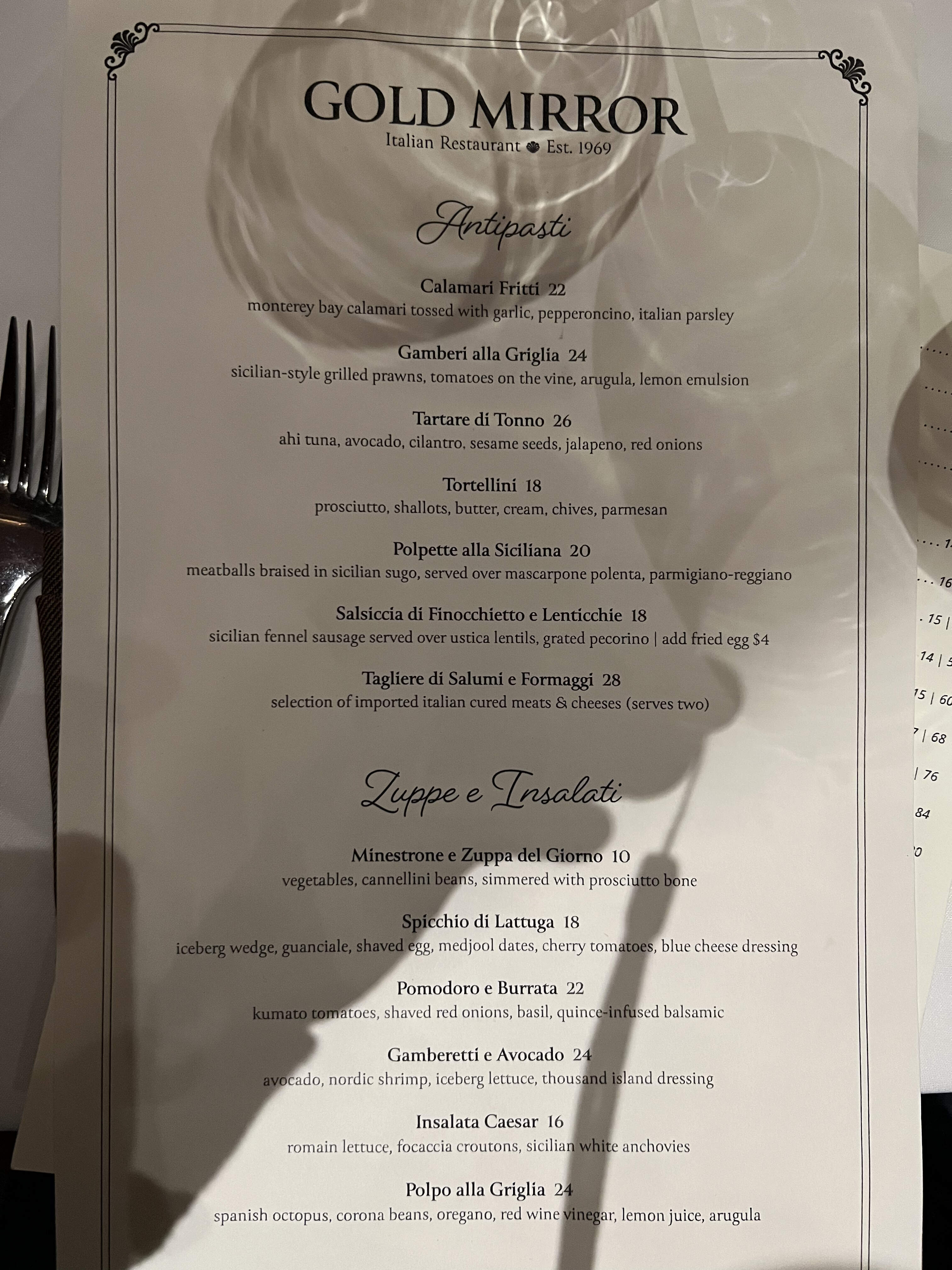 I had an enjoyable dinner at the recently reopened Gold Mirror in Parkside yesterday. The Gold Mirror is an Italian American restaurant that opened back in 1969. It closed in January of 2024 for renovations and reopened at the end of October after almost two years. I’d been a few times before the remodel but hadn’t gotten to write up any reports save for a post about their spaghetti and meatballs.