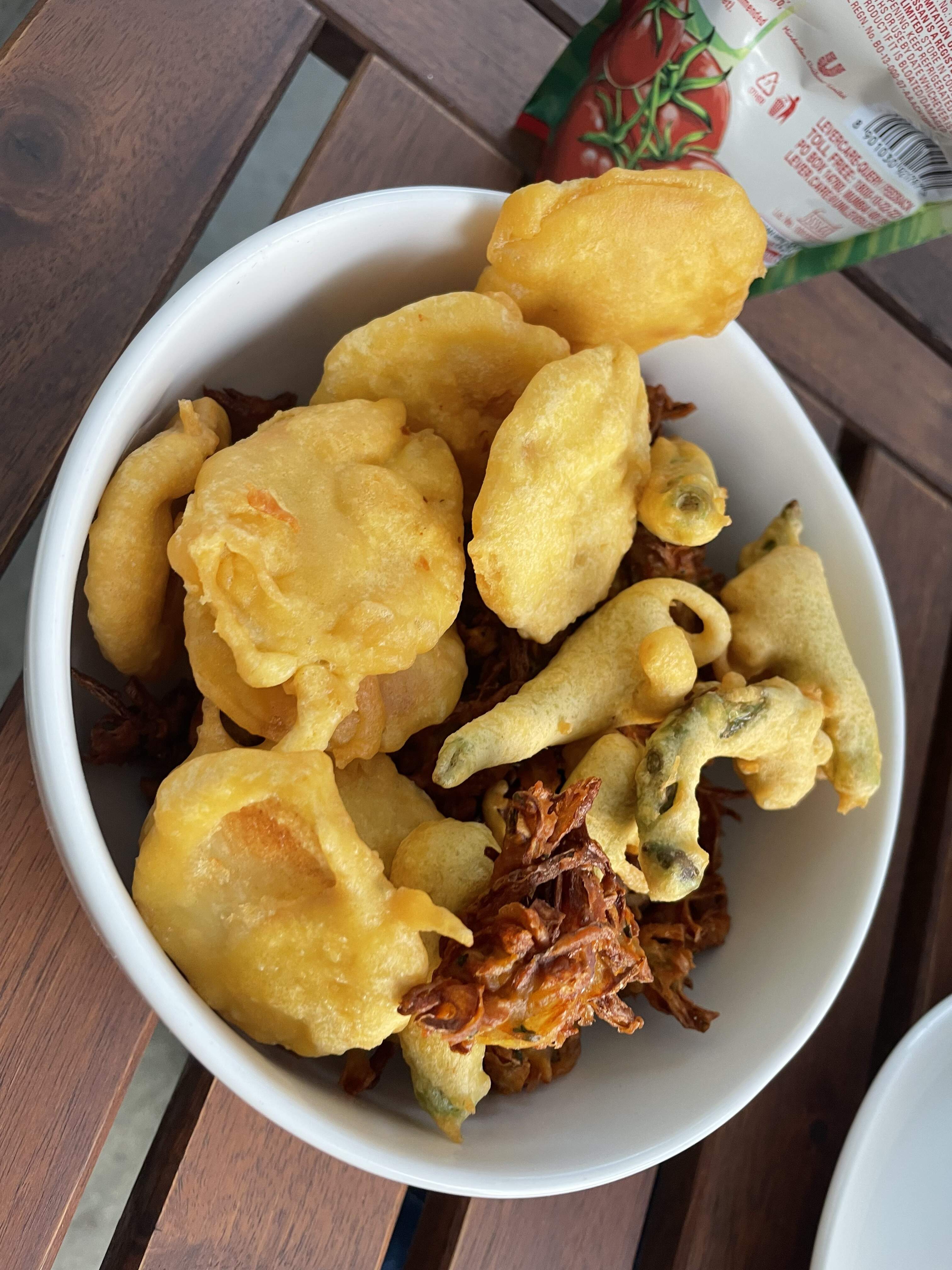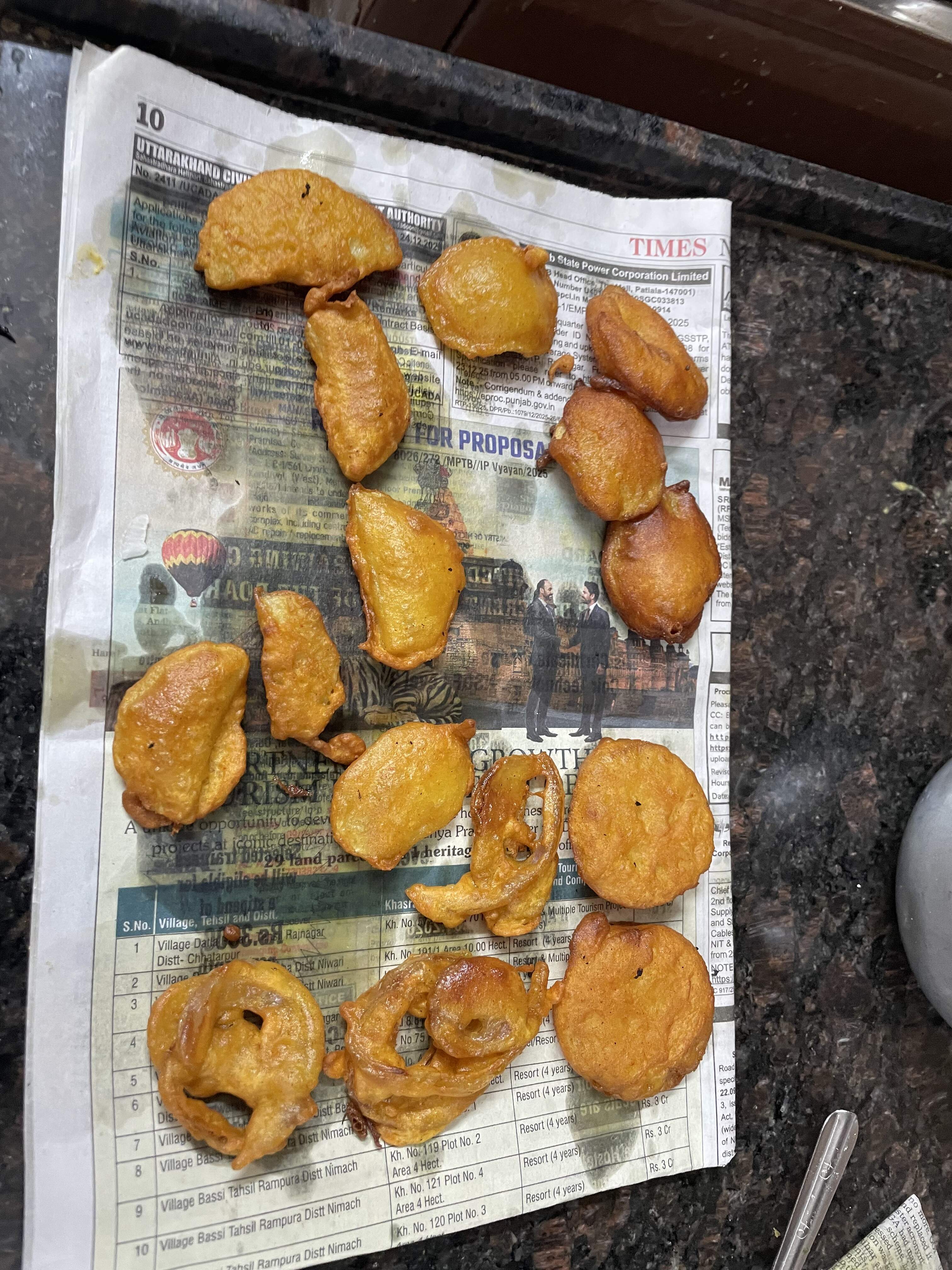 An assortment here of potato, onion, green chillies, spinach, and some other stuff, from various sources, street, home, and restaurant.