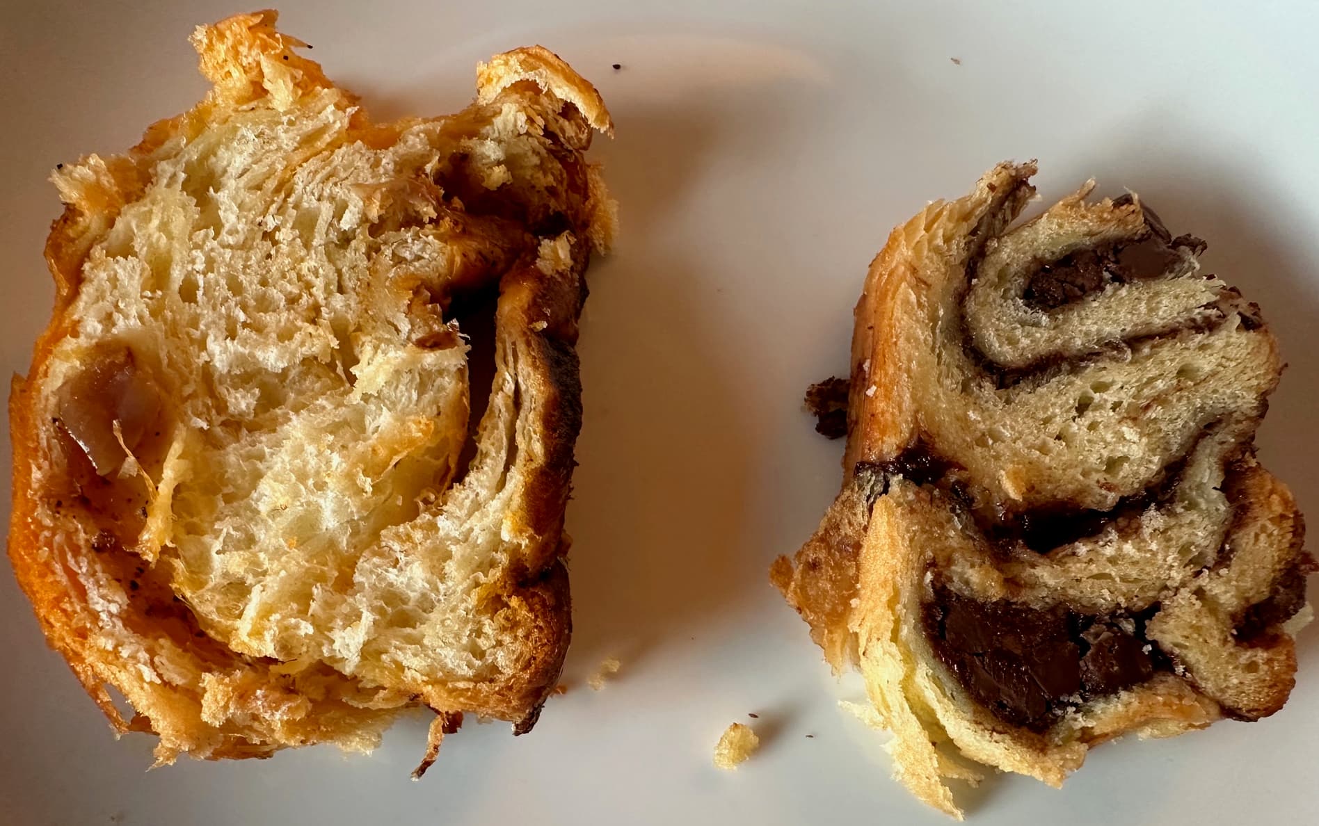 I know bupkis about babka, but I ventured into celebrity territory on Wednesday and procured a loaf of Padma Lakshmi’s onion chutney babka from Breads. Here’s a cross section, with their fabled chocolate for comparison:
