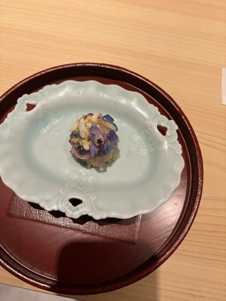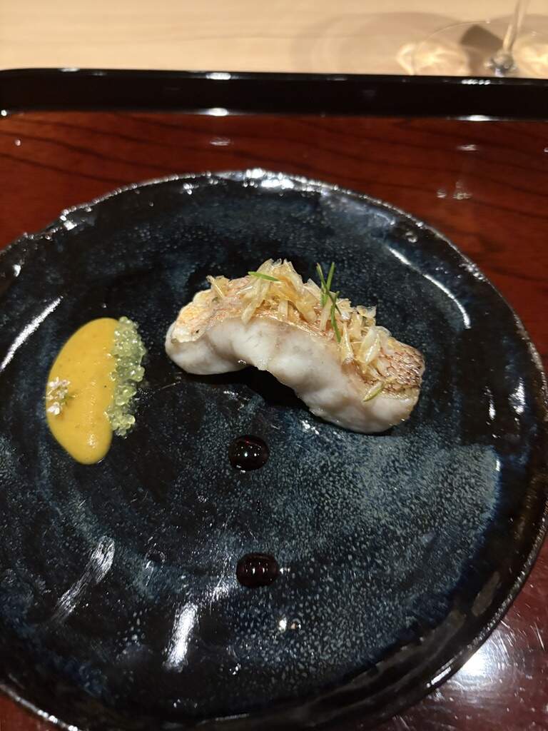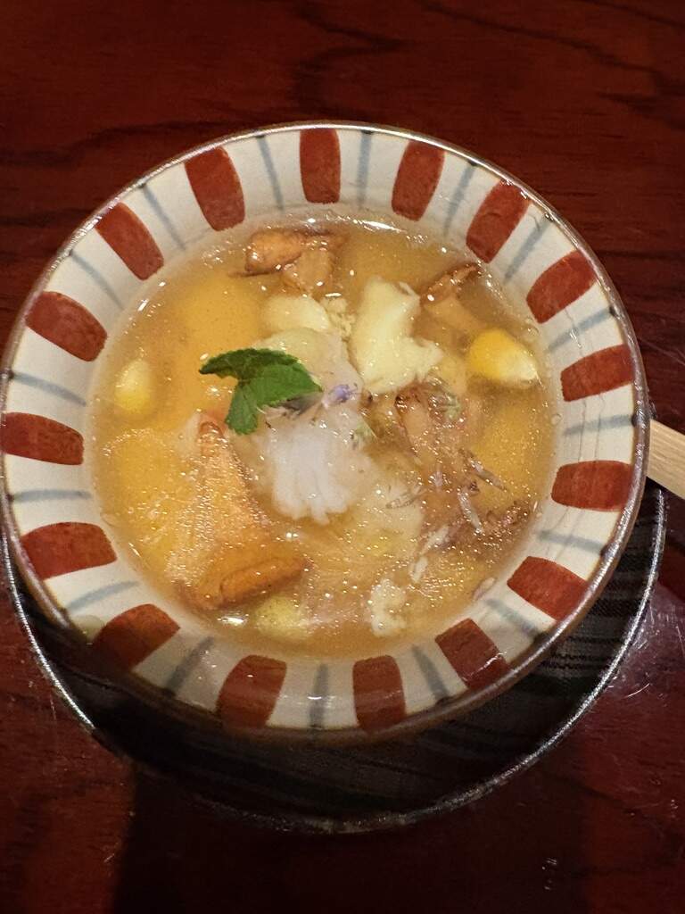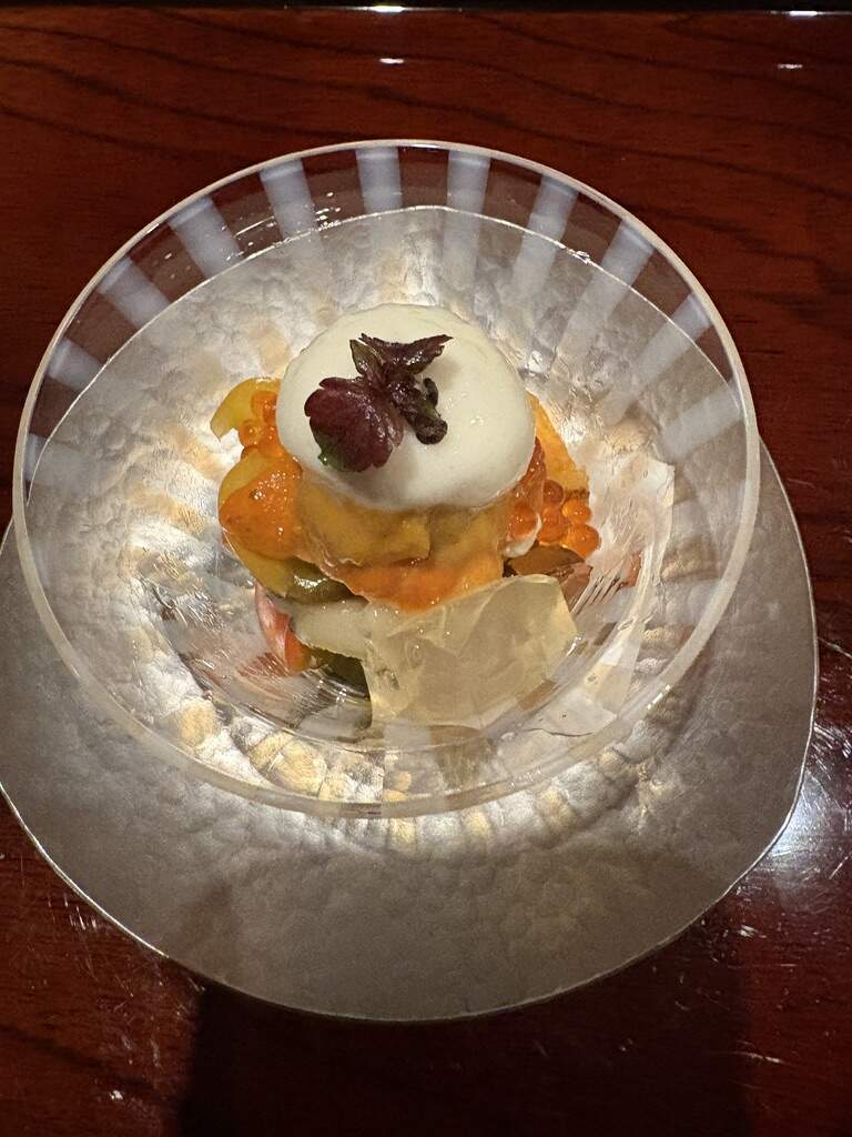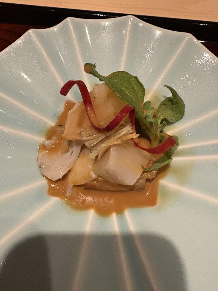 This is uni and abalone with tomato (first item on the menu–I think the pictures pretty much correspond). Anyway, the dish was memorable and delicious! You could taste all of the parts, but it still went together, and I had never had a combination like that. I could say that about pretty much every part of the meal: