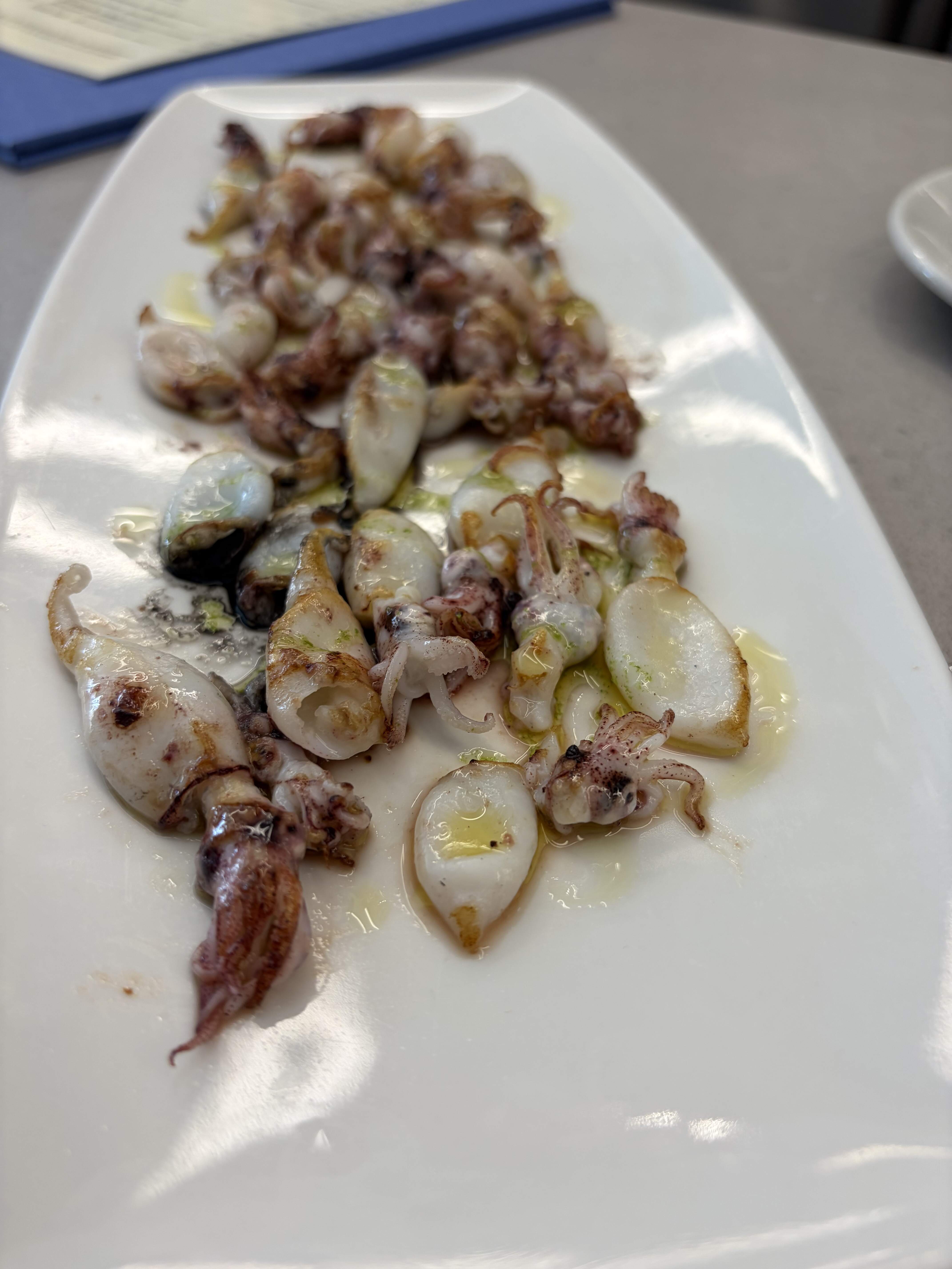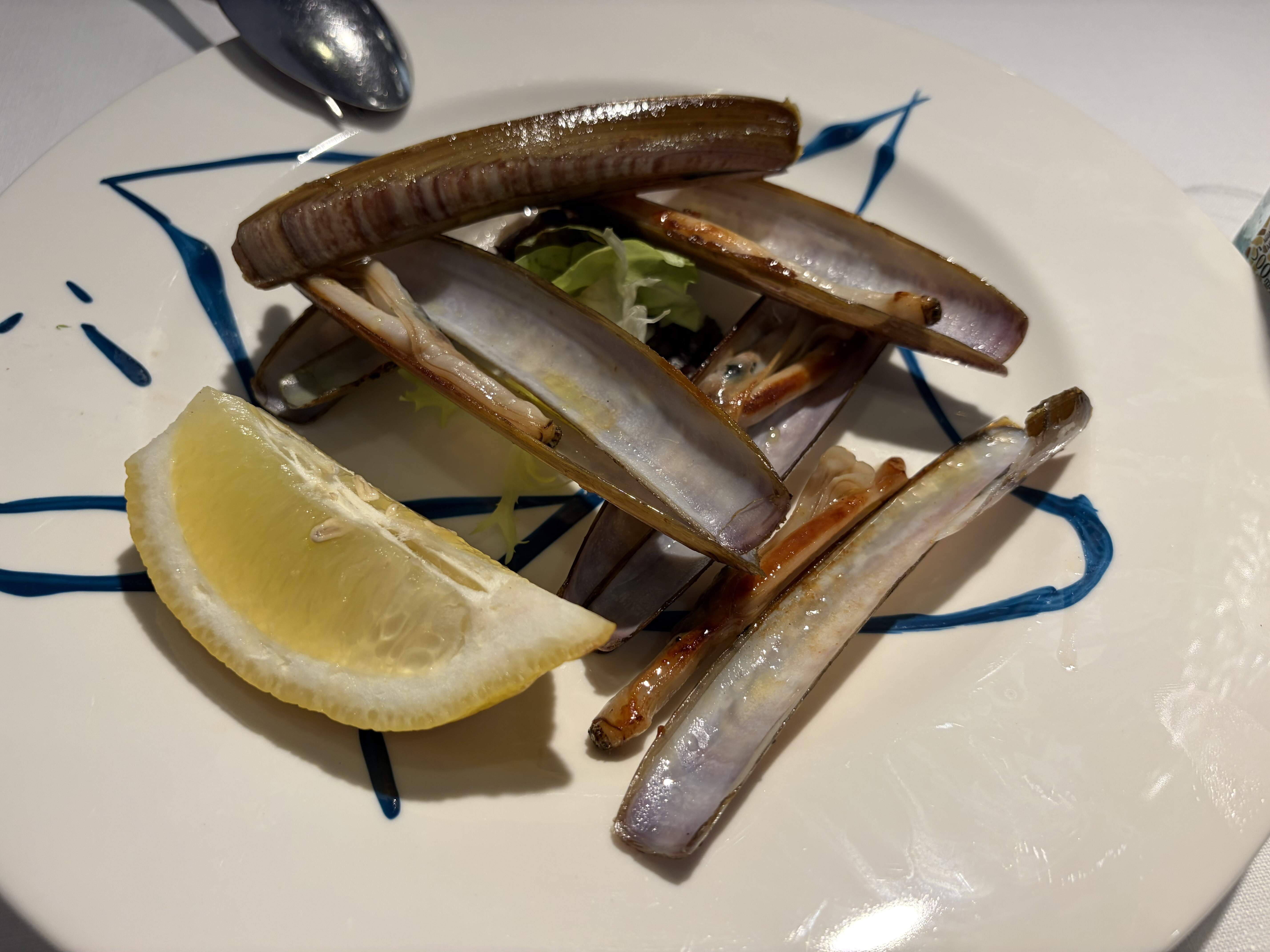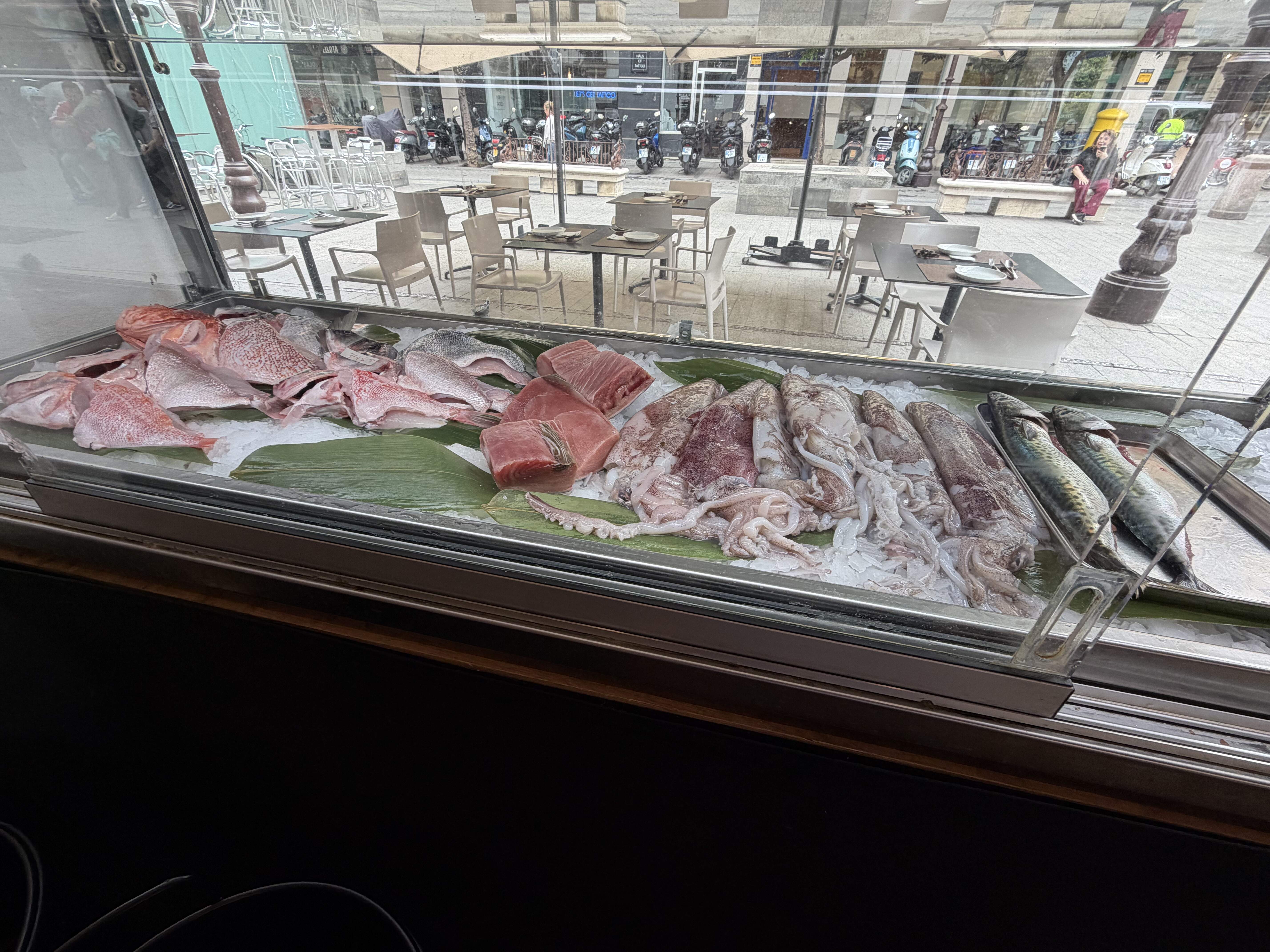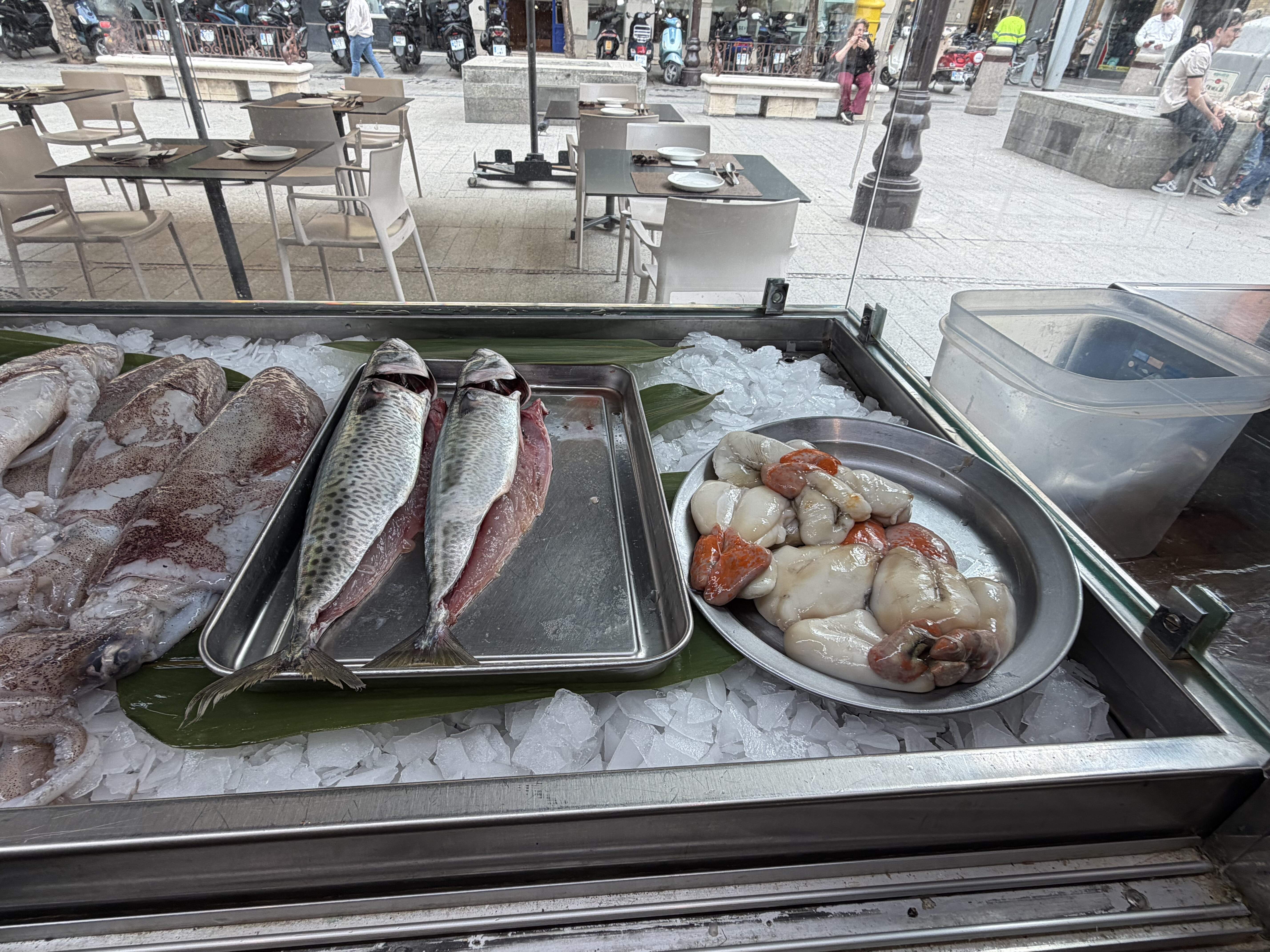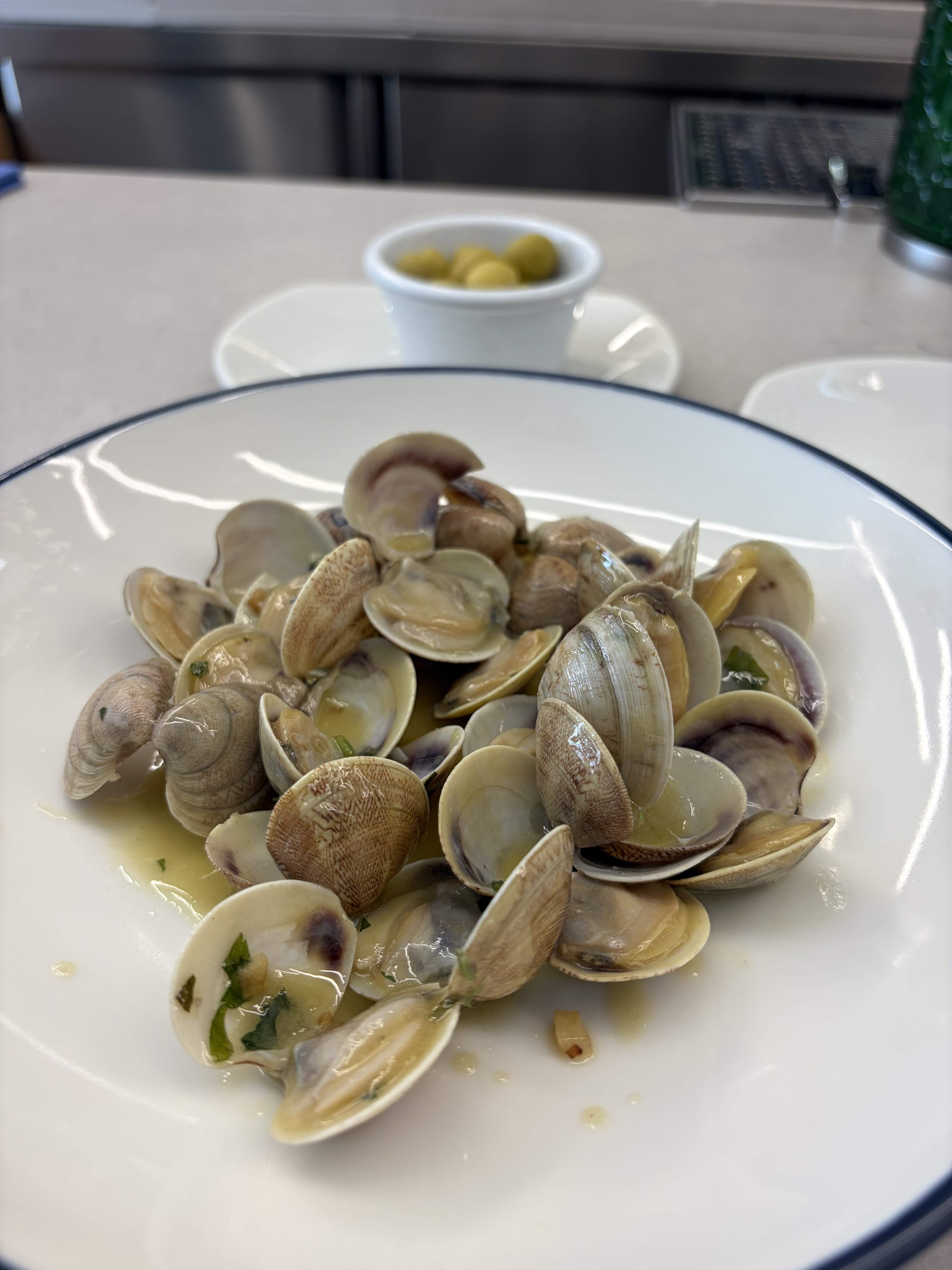 Day 3: After a three hour bike tour and a visit to Fundacion Joan Miro, I was famished and ended up near Barceloneta, where I had an excellent meal at Can Majo. Both their beautiful beachfront terrace and interior were packed on this Sunday afternoon, but they managed to find me a table inside. What fun to see multigenerational families out in their Easter finery celebrating with beautiful feasts and gifts. I had an excellent meal of boquerones, juicy razor clams, and al dente paella with Galician clams and shrimp, portioned for one.