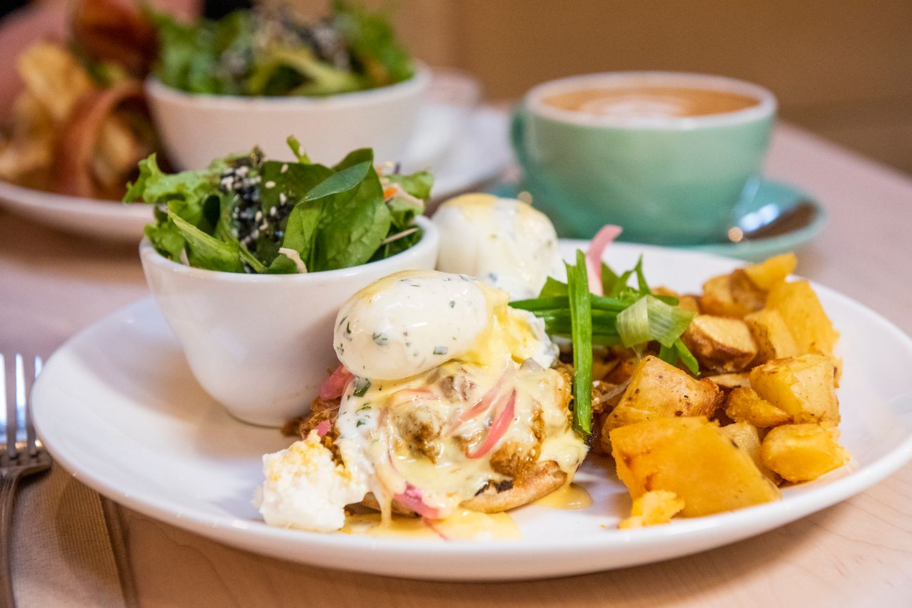 As noted by @thelverage, and also a nice couple brunching near me on the patio, the Benny is served on Banoi sourdough. Tots or frites are offered as optional sides , for a small cost. As someone watching her weight, I prefer this approach to brunch potatoes!