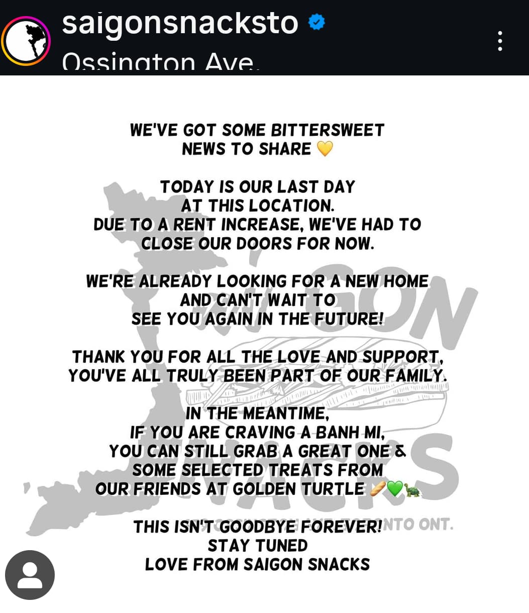 Saigon Snacks on Ossington has closed due to a rent hike. They plan to open elsewhere. Follow on IG for news.