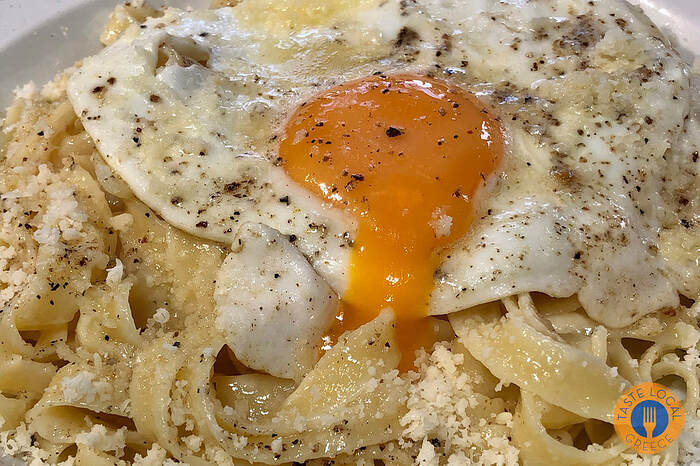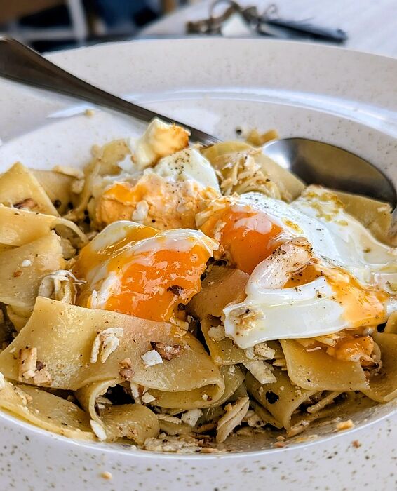 Makaronada Tsouchtí topped with fried eggs and mizithra cheese