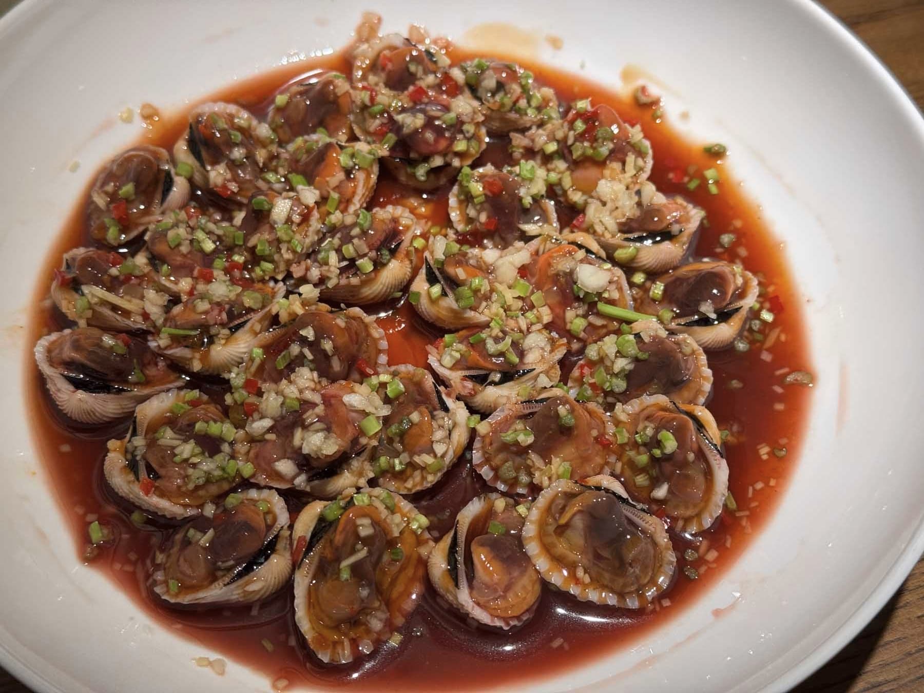 I don’t know exactly what kind of shellfish it was. It was raw, very fresh, on a vinegary marinade. Nobody else ate raw in my party so I polished off the whole plate.