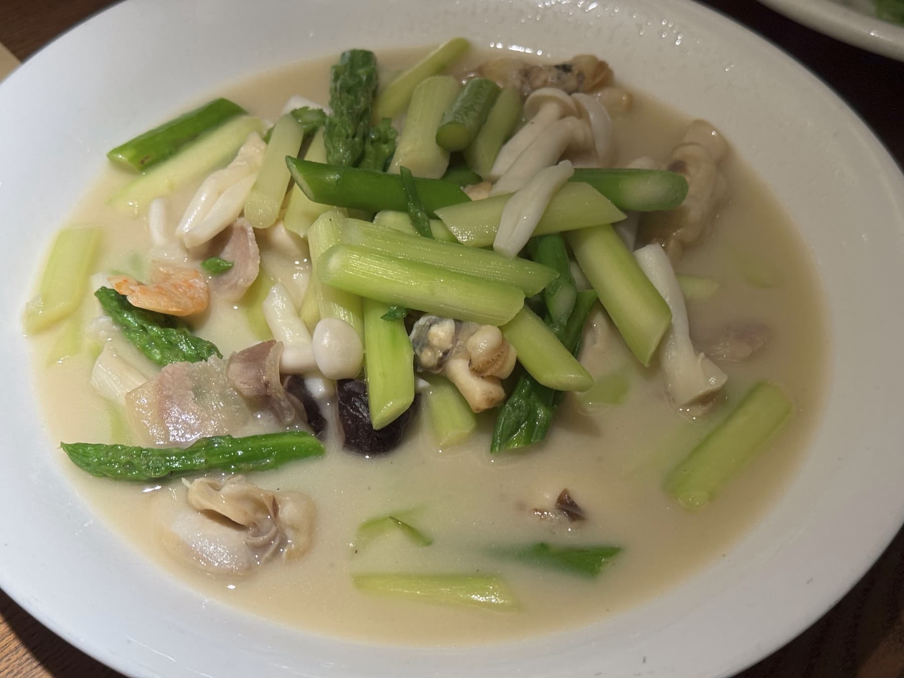 Asparagus, mushroom, dried shrimp in stock. Very flavorful. Our local farmer’s market had the best asparagus vendor we had eaten in the States who used to supply some ** restaurants. This asparagus was right up there. Very tender.