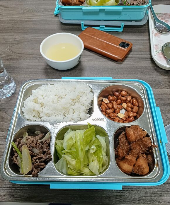 Lunch at the hospital. My white British vegetarian colleague had warned me that lunch at the hospital was ‘dire’. But I was pleasantly surprised. I think the vegetarian option might have been dire. The lunch came in a cute bento type container - I told them I ate everything, so I got a slightly soupy beef preparation with onions, carrots and a green stem like vegetable (water spinach? Morning glory?), stewed pork belly in a sauce that was slightly sweet and star anisey, steamed cabbage, boiled peanuts and steamed rice. The only thing I didn’t really care for was the bowl of clear soup which just tasted salty.