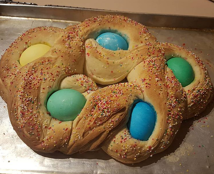 The baker was at work all day today so I decided to surprise him with something of my own, a traditional Easter Bread. Believe it or not, this is the first bread I’ve ever baked in my entire life. I’m a cook, not a baker. It is currently cooling. Smells delicious but will have to wait for tasting until tomorrow.