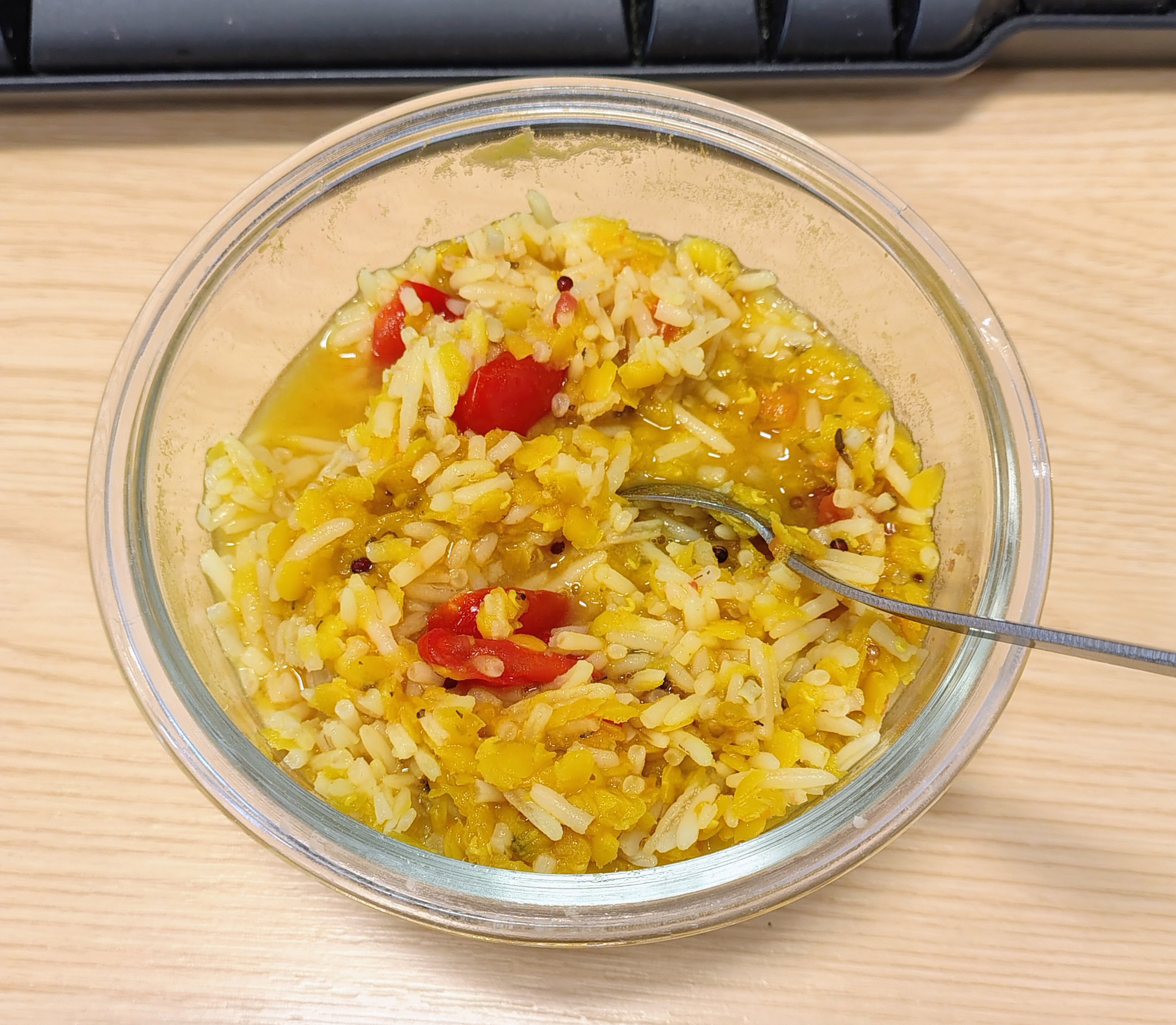 Saffron rice. Baked beans flavoured with curry powder, dried apricots, and Major Grey chutney on the side.