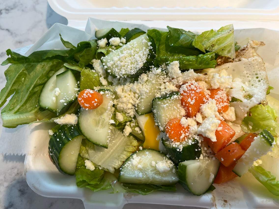This is so obviously not a “salad” that I had to take a photo. I mean, there is nary a shred of carrot or stray cucumber in there. So, we decamped to home. Very helpful nice staff, wrapped up all the orders happily, and then we walked home to fix their lackluster food.