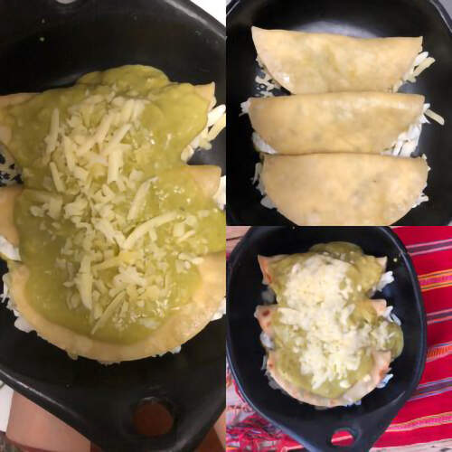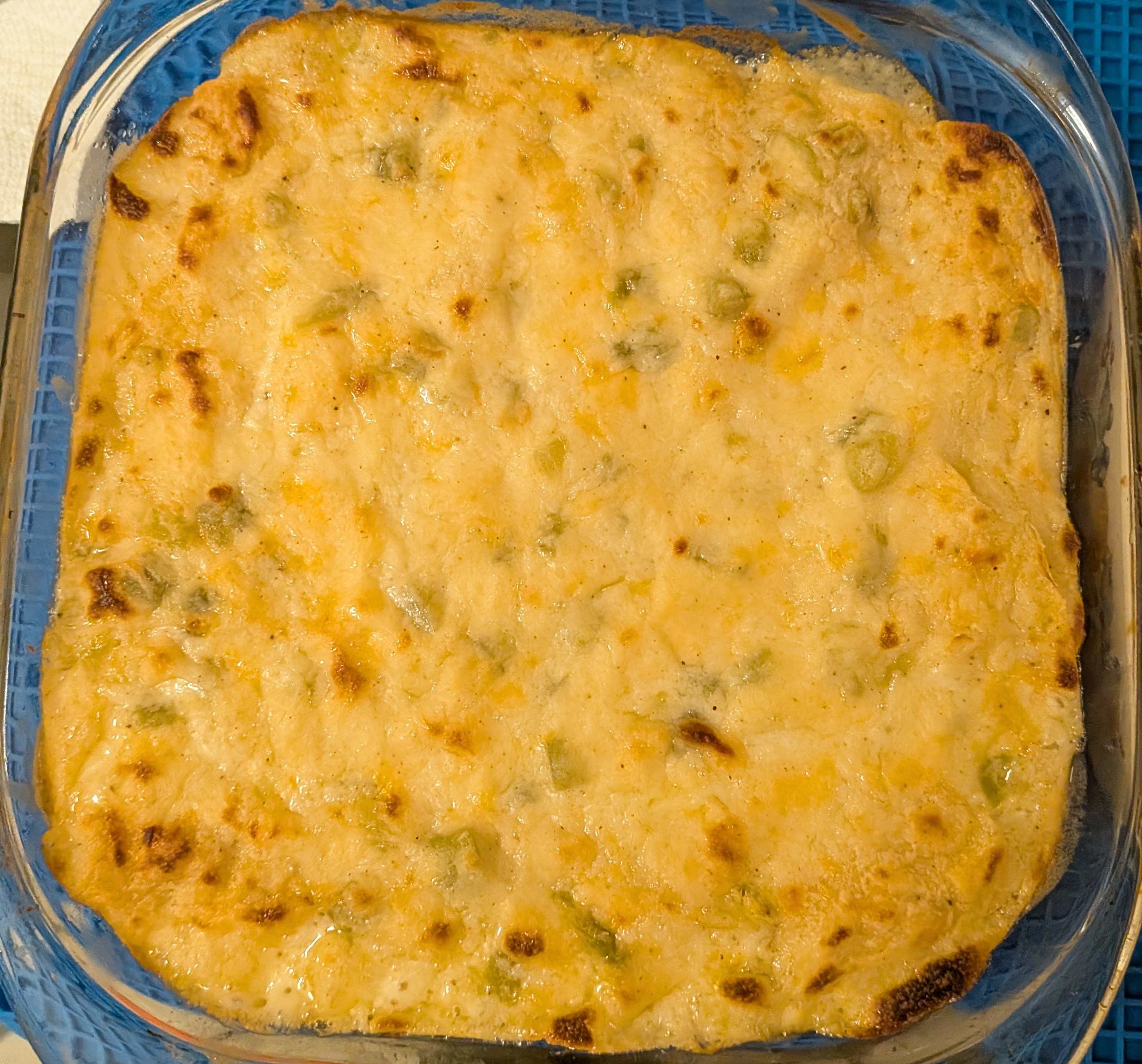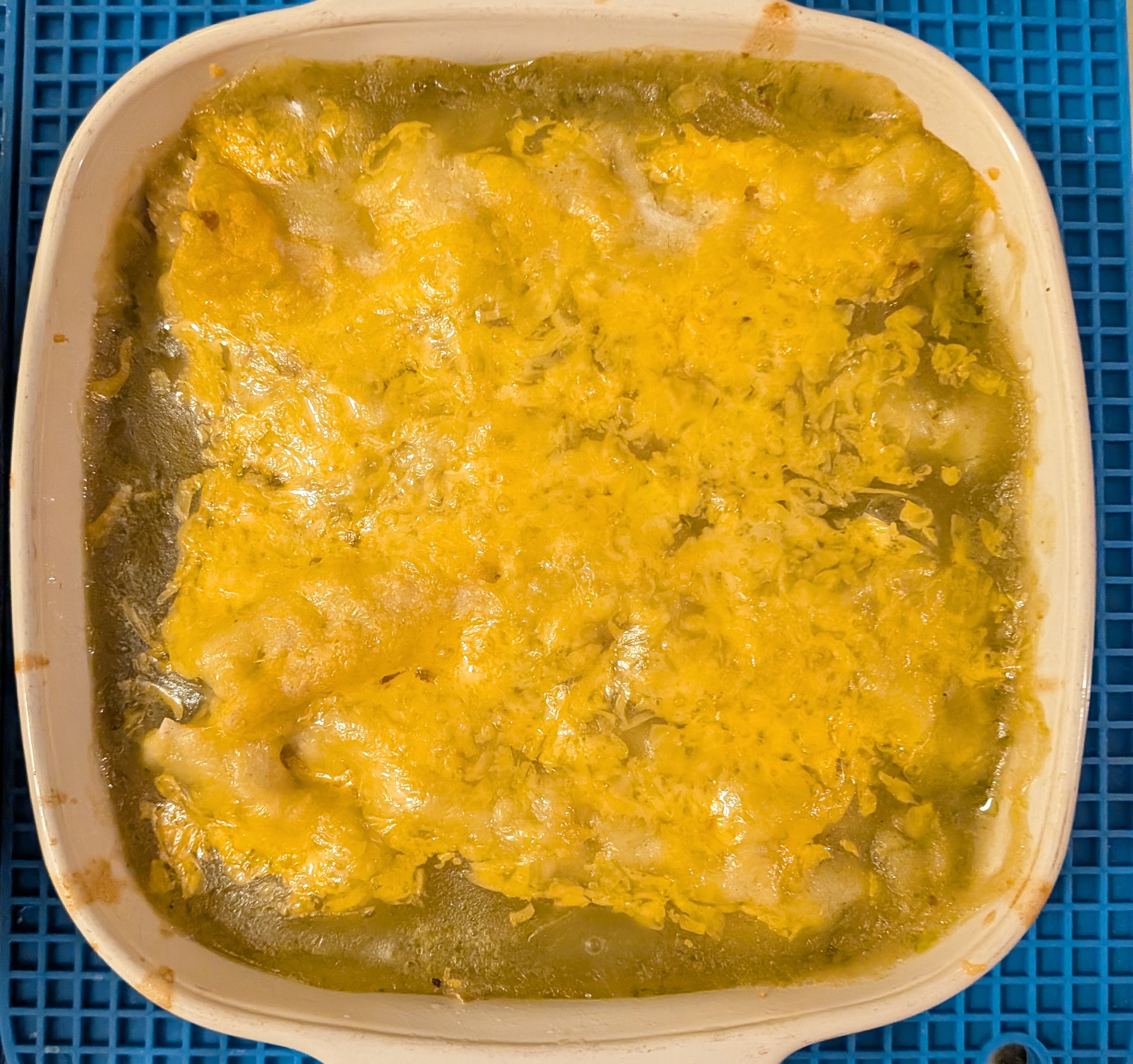 lower salt crab and shrimp enchiladas in a white sauce with green chilies, Aleppo pepper, and chili powder. Some sour cream, cream cheese, and green chilies mixed into the crab and shrimp mixture inside the corn tortillas. A little bit of shredded cheddar, cumin and chili powder mixed into the white sauce that topped it.