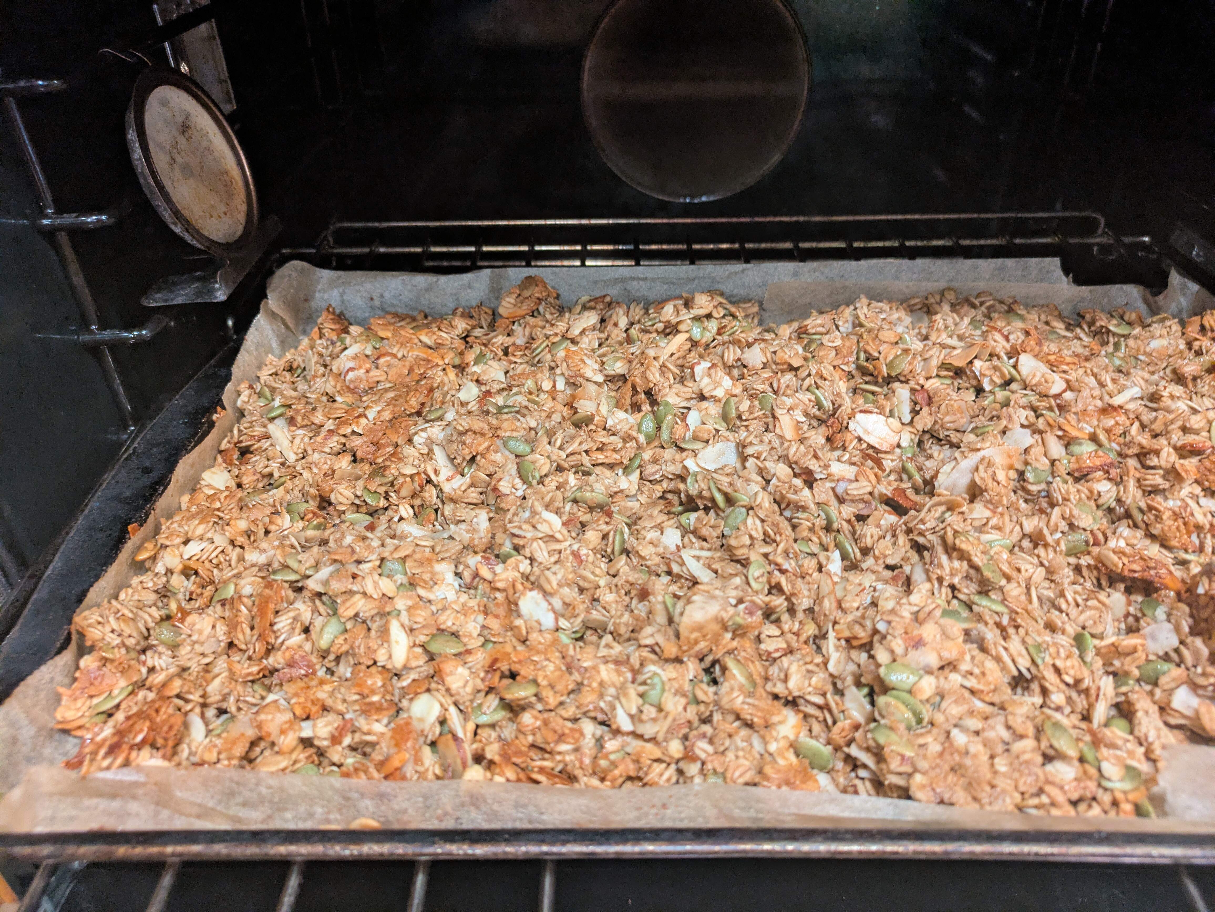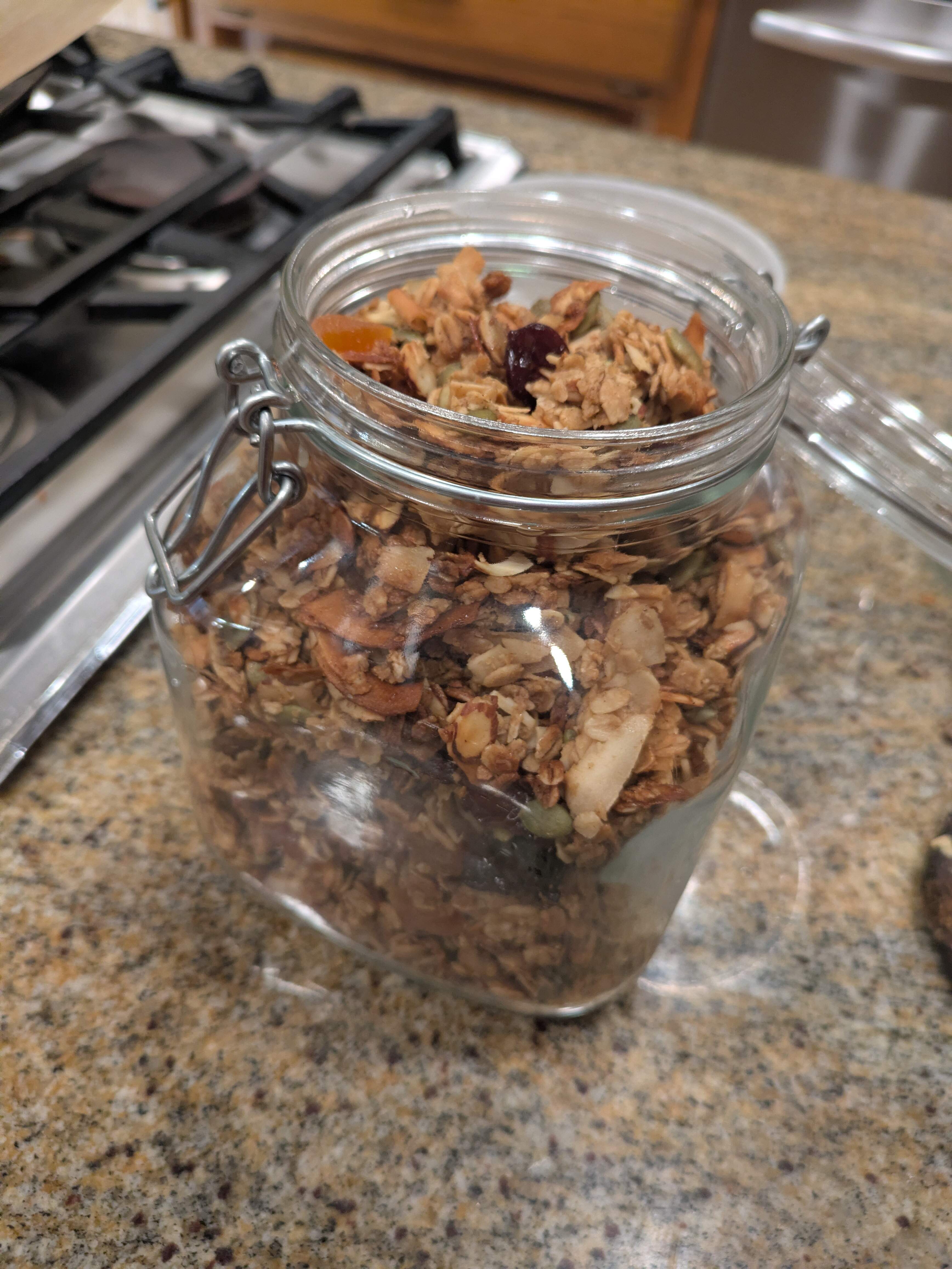 My favorite version of granola….this year. Perfectly crunch clusters, sweet but not too sweet. After baking I added some amazing golden raisins from a place in LA, local dried apricots, and my new favorite dried fruit; tart cherries from a local stand, that are probably from somewhere in the PNW.