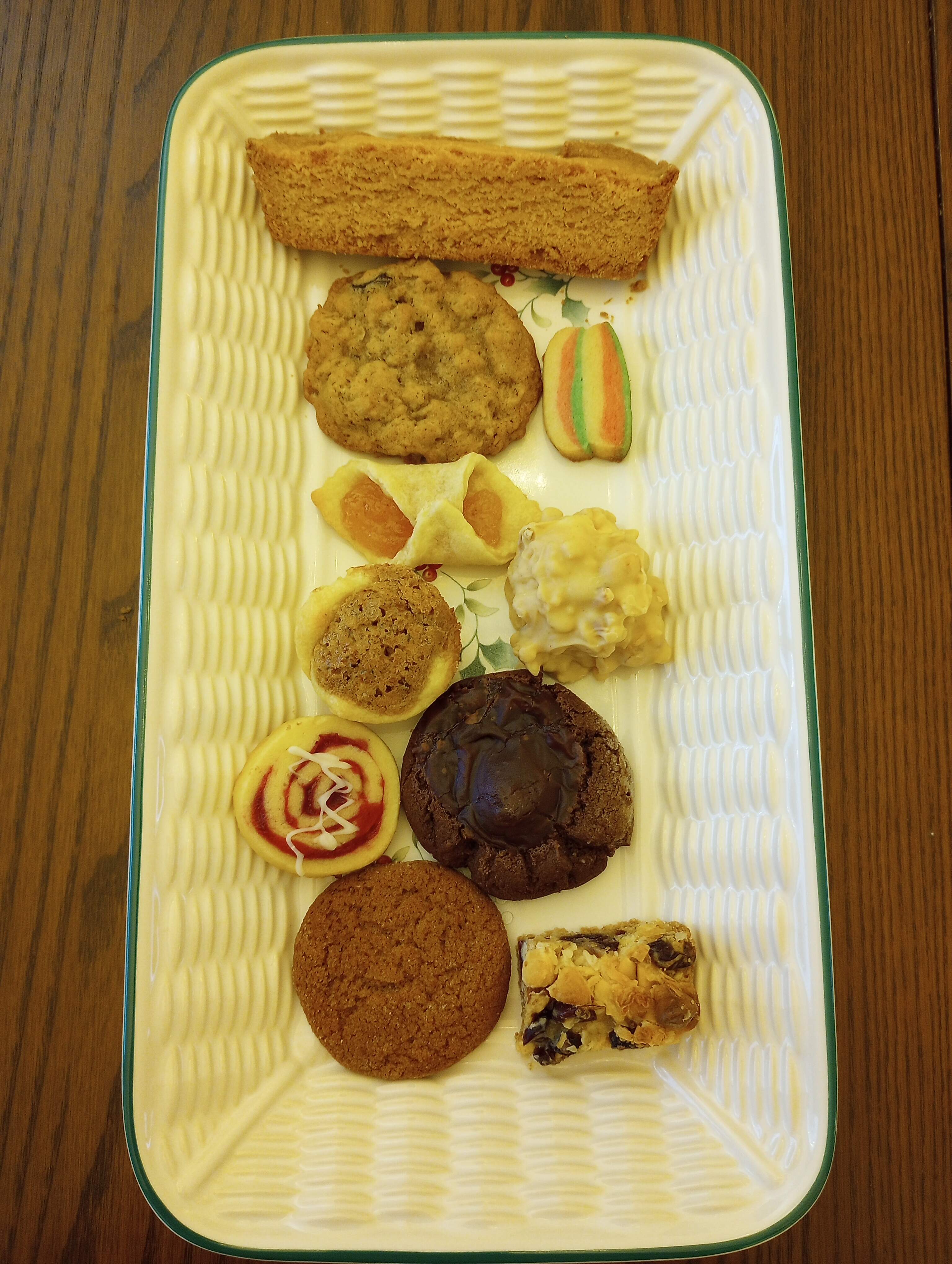 Boxes mailed. I am very happy with this year’s baking. My cookies always look definitely homemade aka “rustic”. But line them up on a plate and they still get “oooh’s”. Top to bottom left-right: almond biscotti, oatmeal raisin - lemony stripes, apricot foldover - Mary B’s PB/marshmallow/Krispies candy, Pecan tassie, cranberry spiral - chocolate covered cherry cookie, Molasses Ginger Snap - Coconut Cranberry bar.