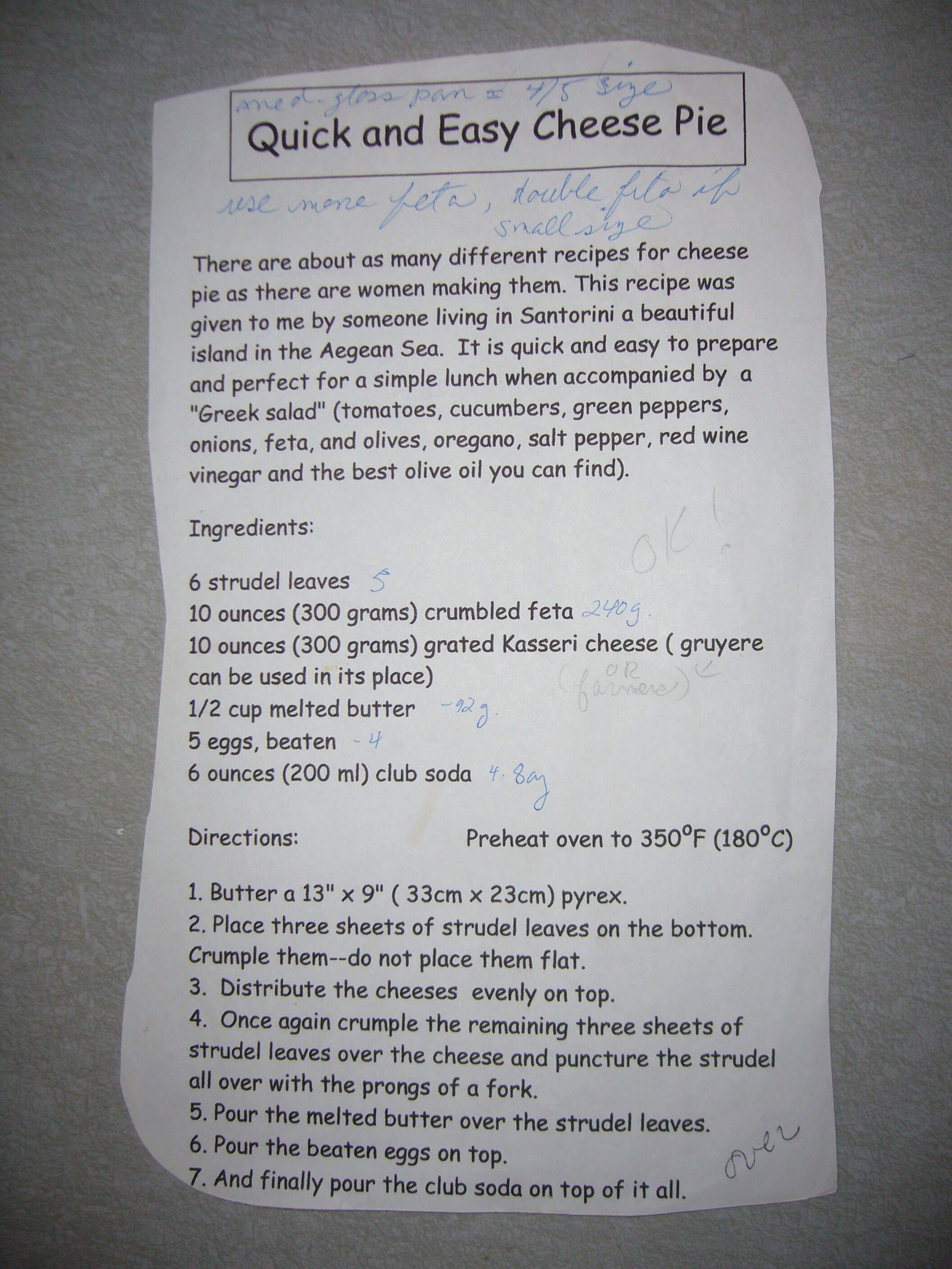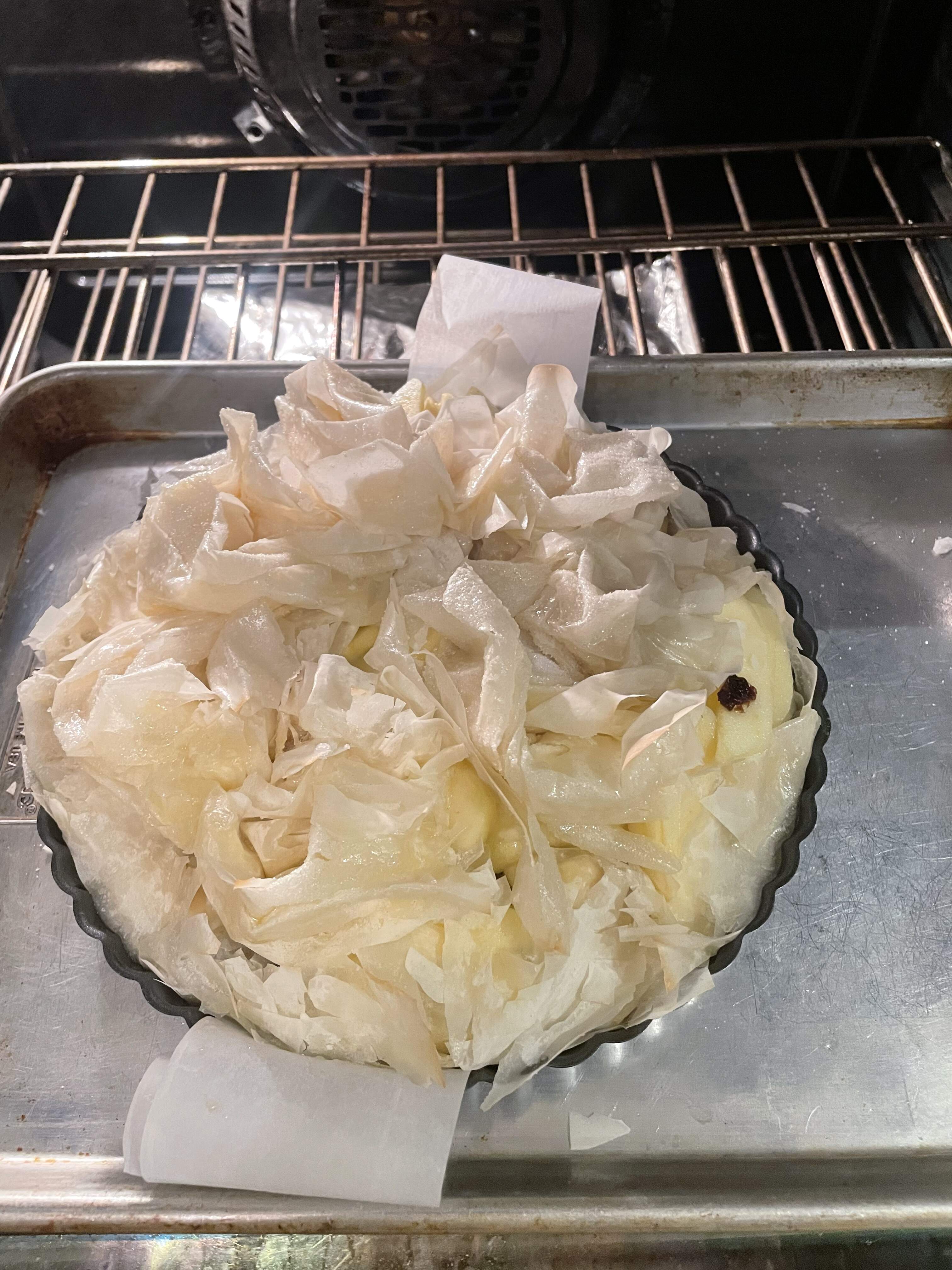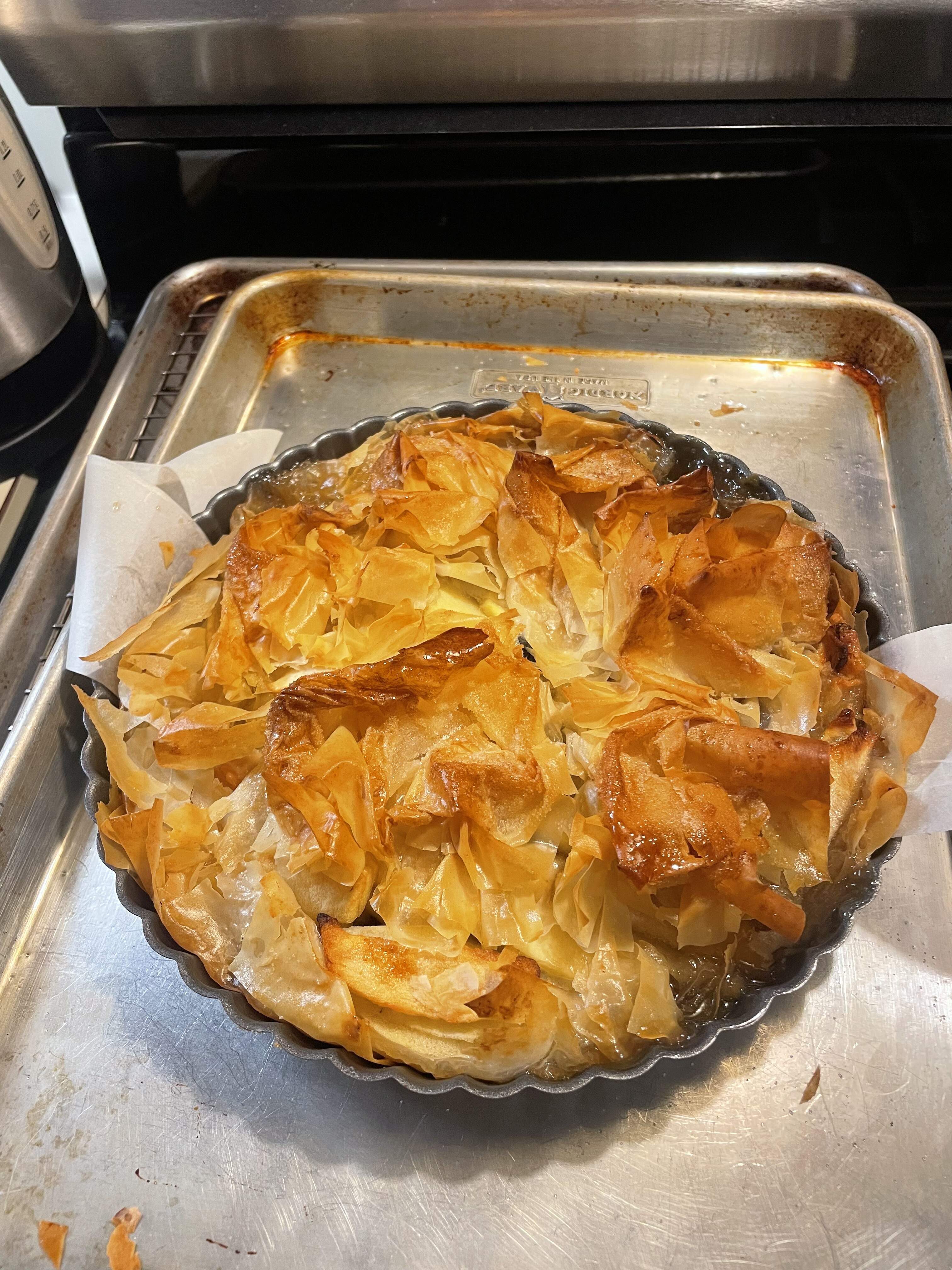Wow “crunched-up phyllo…in a savory application” made me search for a forgotten (but I remember as delicious) recipe. Found it! It bakes for 35- 40 minutes, check at 20 minutes to be sure it isn’t browning too quickly. (The little scribbled notes are just me downsizing amounts for a smaller pie.)