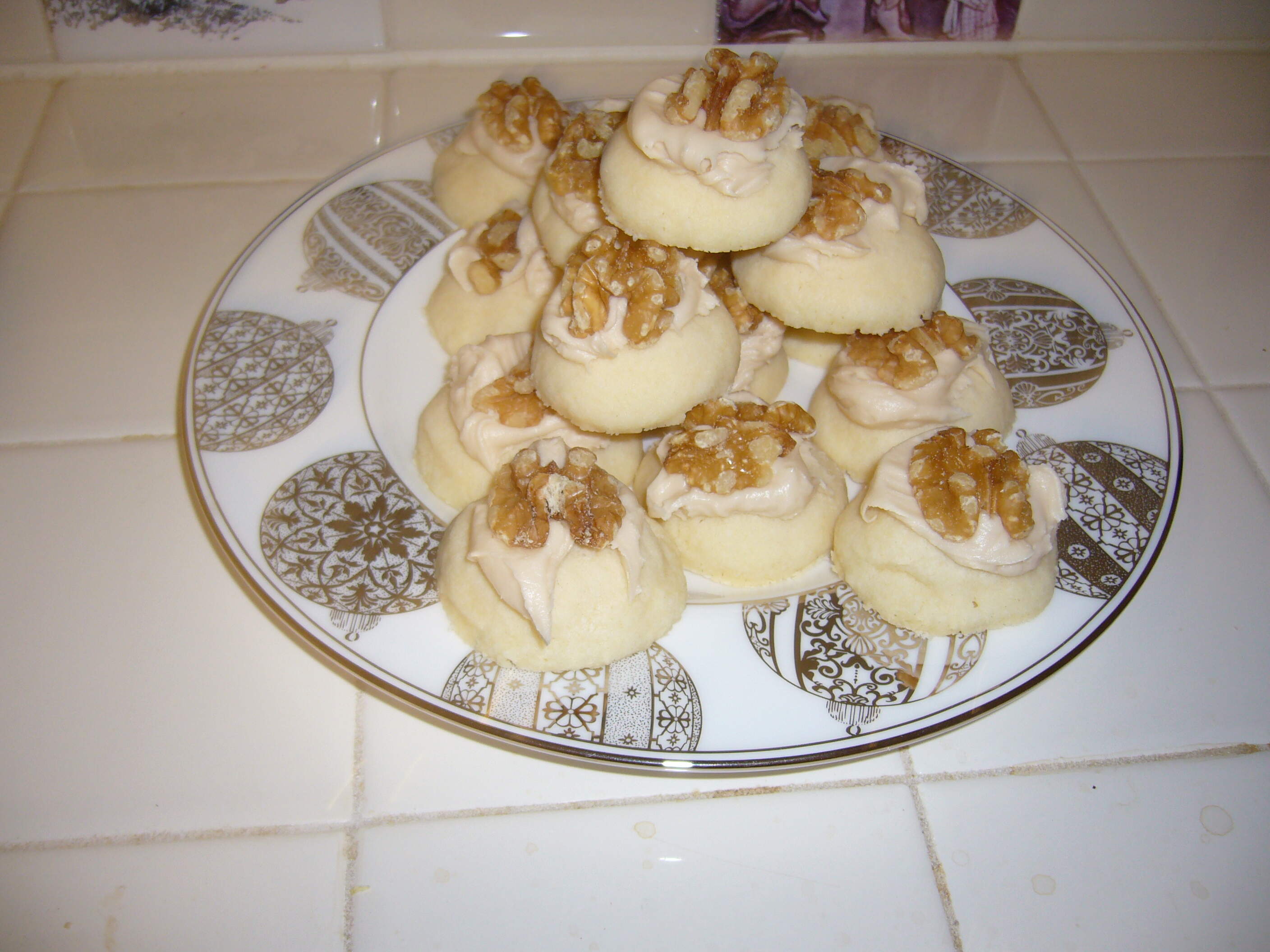 1 cup flour … 1/2 cup cornstarch … 1/2 cup powdered sugar … 1 1/2 sticks butter. That’s it. I frost them with maple frosting and a half walnut.